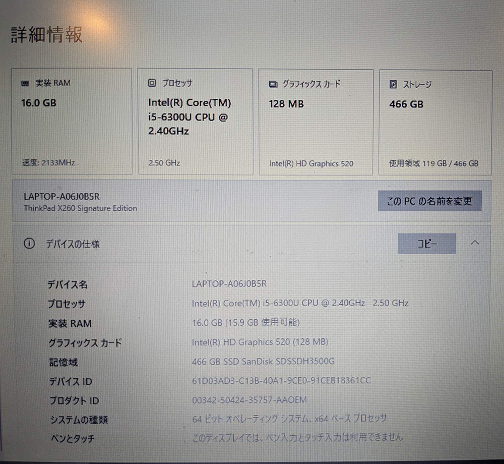 Lenovo ThinkPad レノボ X260 CPU Core i5-6300U 2.4GHz メモリ16GB SSD500GB Win10 Pro ノートパソコン PC 12.5型