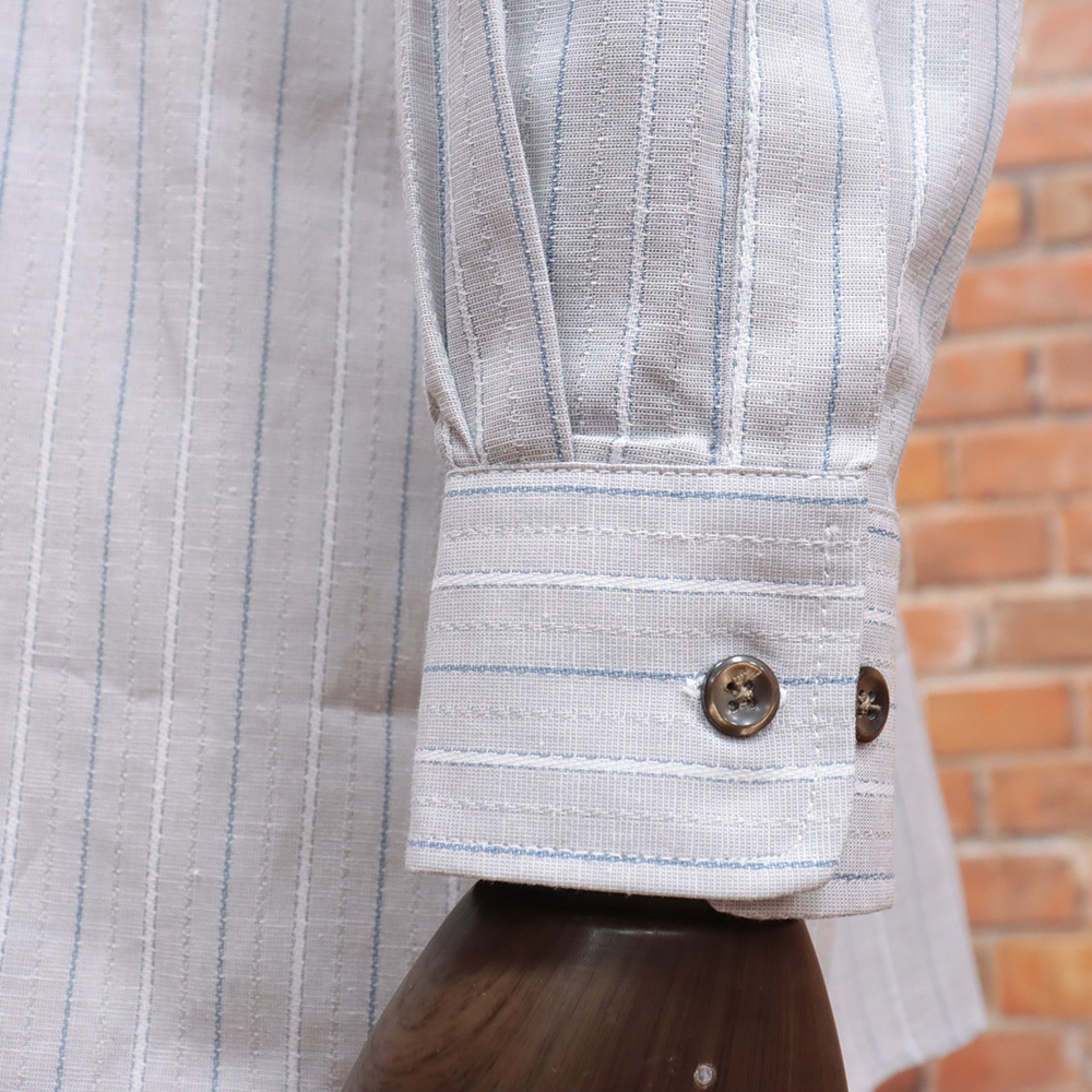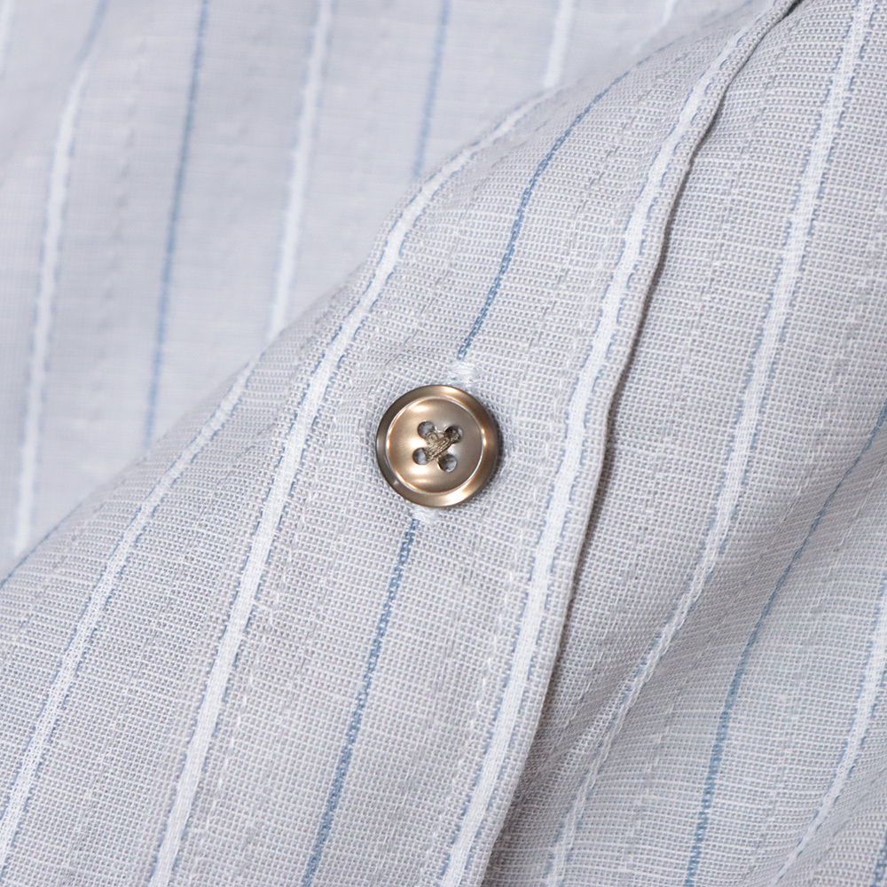 涼やかなグレー×ホワイトの配色に、夏でも快適に着られる軽やかな素材感が魅力の長袖シャツ。綿・ポリエステル・麻をバランスよくブレンドした清涼感のある生地は、吸湿性と速乾性に優れ、ご家庭でのお洗濯も簡単。汗ばむ季節にも快適な着心地が続きます。