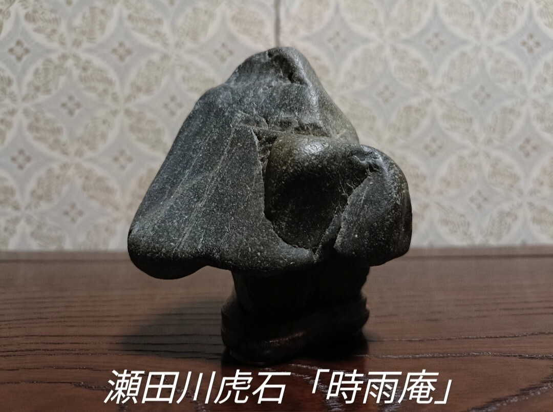 瀬田川らしい重厚な黒味に、しっとりとした梨地の肌合いが冴える天然うぶの虎石。まるで雨雲のたなびく庵を思わせる佇まいから、銘「時雨庵」。片側に抱えたように盛り上がる丸味の塊と、扇を伏せたような静かな面の対比が見事で、茅舎石特有の“庵に籠る孤峯”の趣を自然の造化そのままに宿しています。