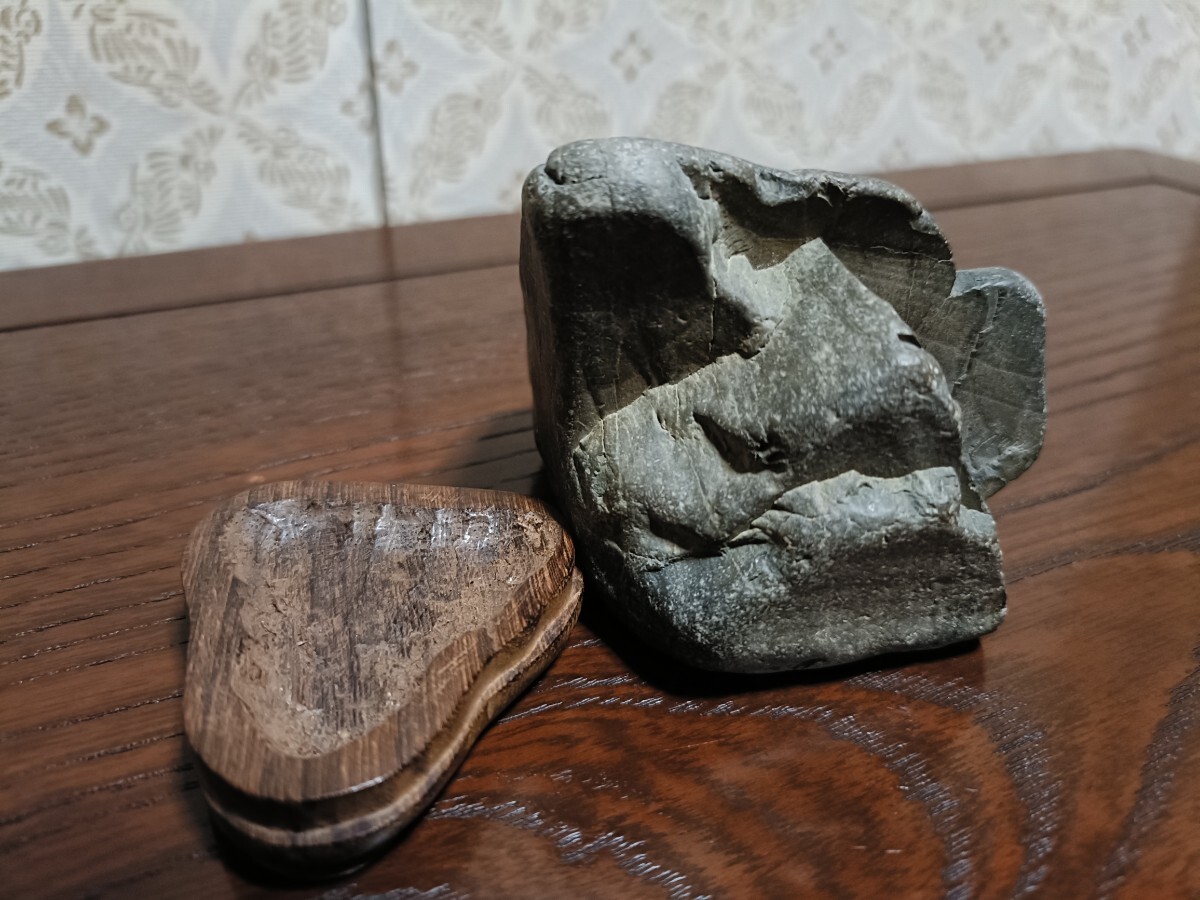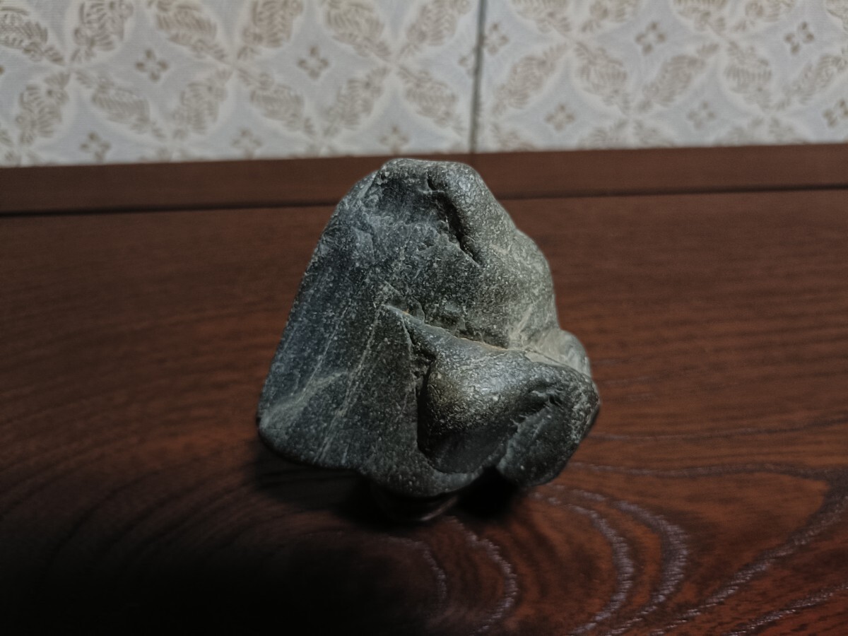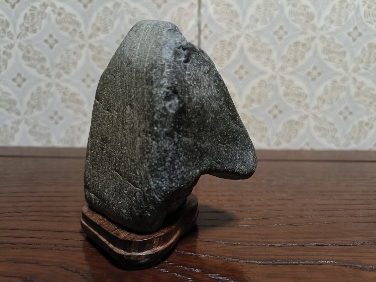 正面には細い縦の溝がすっと走り、時雨の糸のように柔らかな余情を添えます。荒々しく削れたようでいて、長年の水磨による穏やかな丸みも共存し、瀬田川石ならではの“鋭さと温み”が同居する逸品。虎石の力強い骨格を持ちながら、角張らず、どこか沈潜した文人趣を感じさせます。