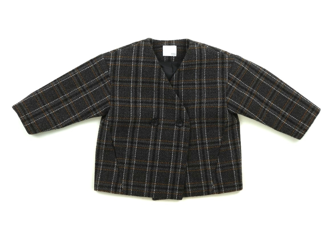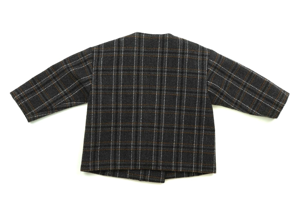 ポリエステル100%。ツイード調生地。裏地付き。前ボタン開き。実際のサイズ表記は、100-110cm。目立った汚れのない良品です。