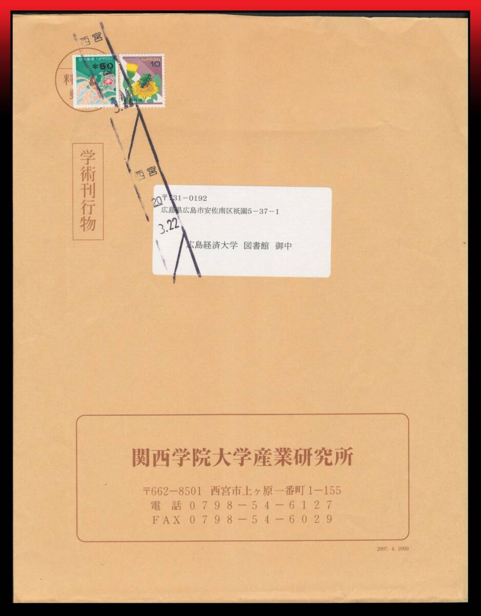 H73 学術刊行物/印字コイル|印字50円虫10円/第4種学術刊行物重量書状※ 新ローラー印:西宮/20/3.22 定形外発送※ エンタイア