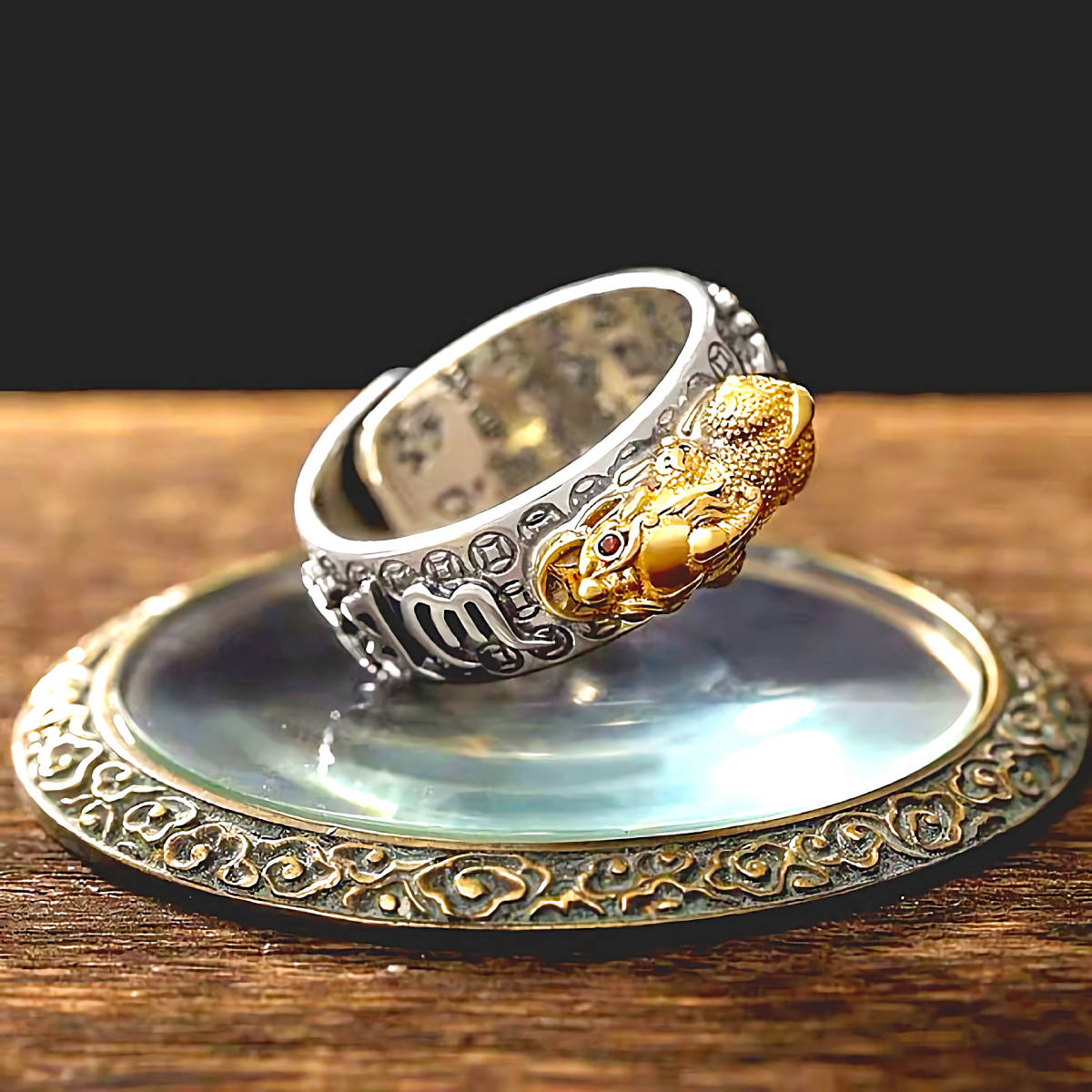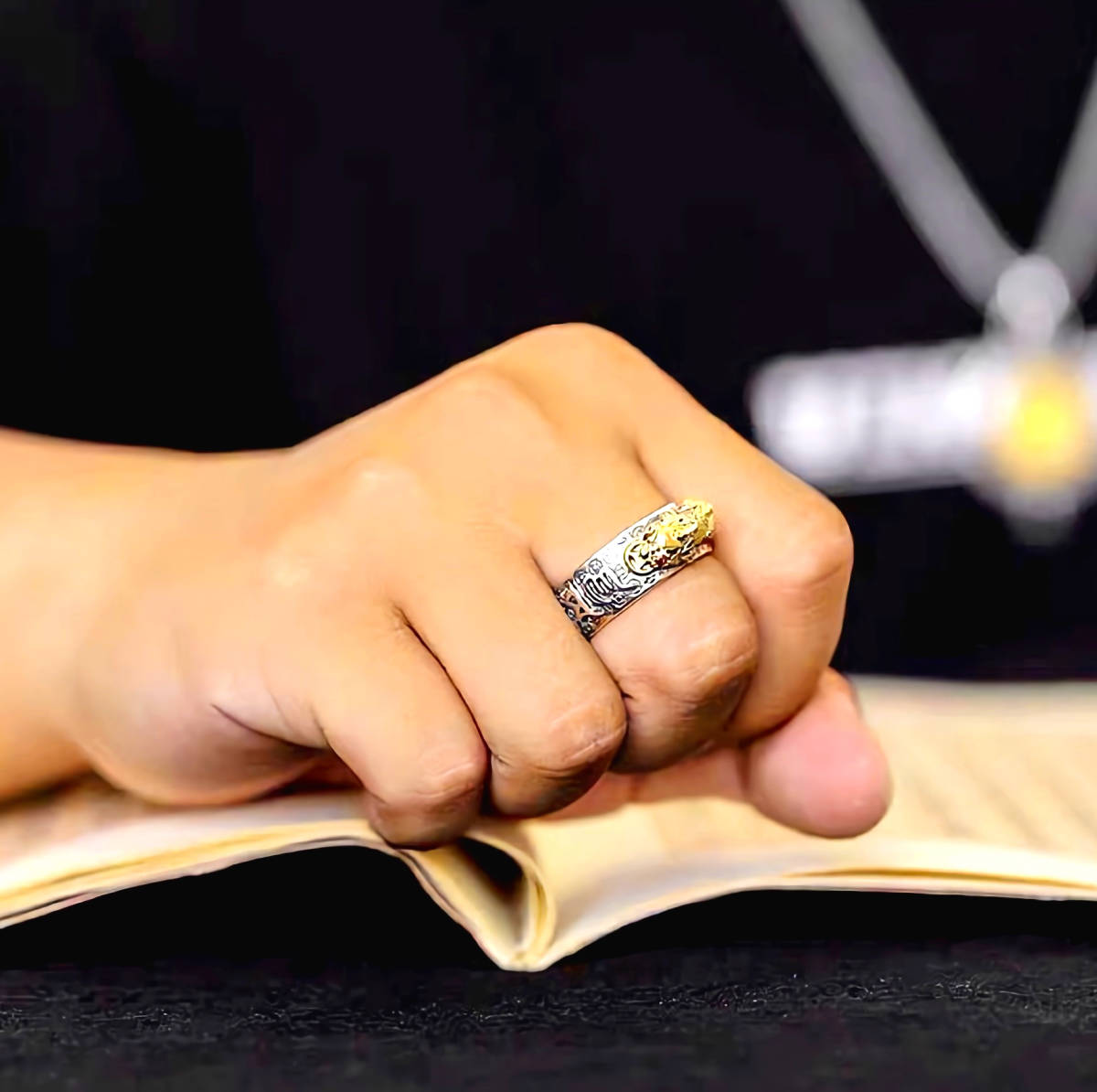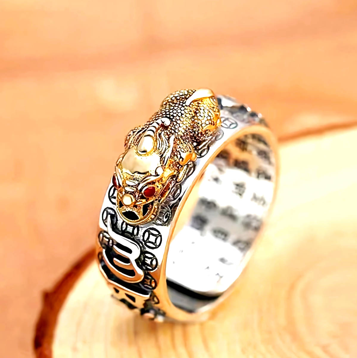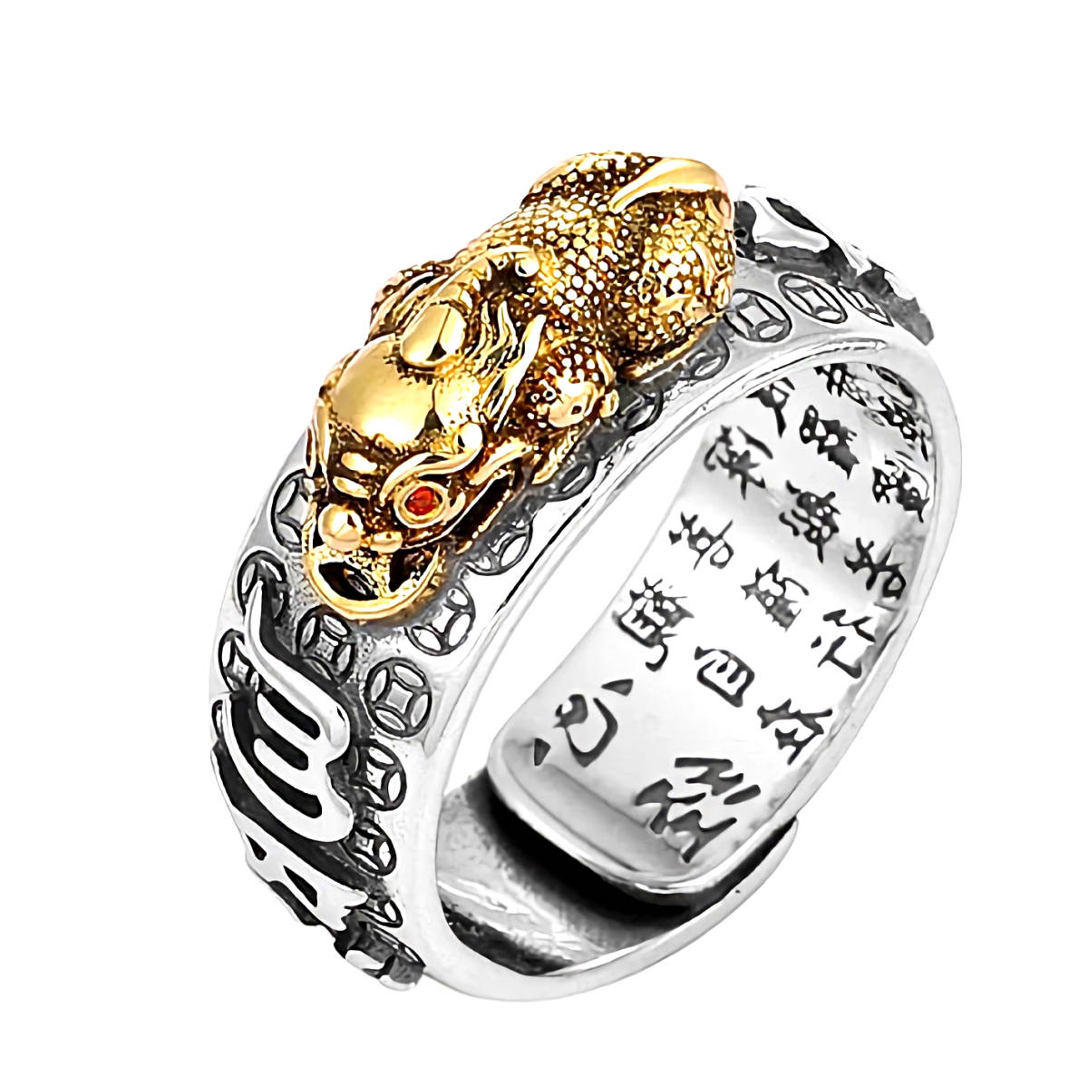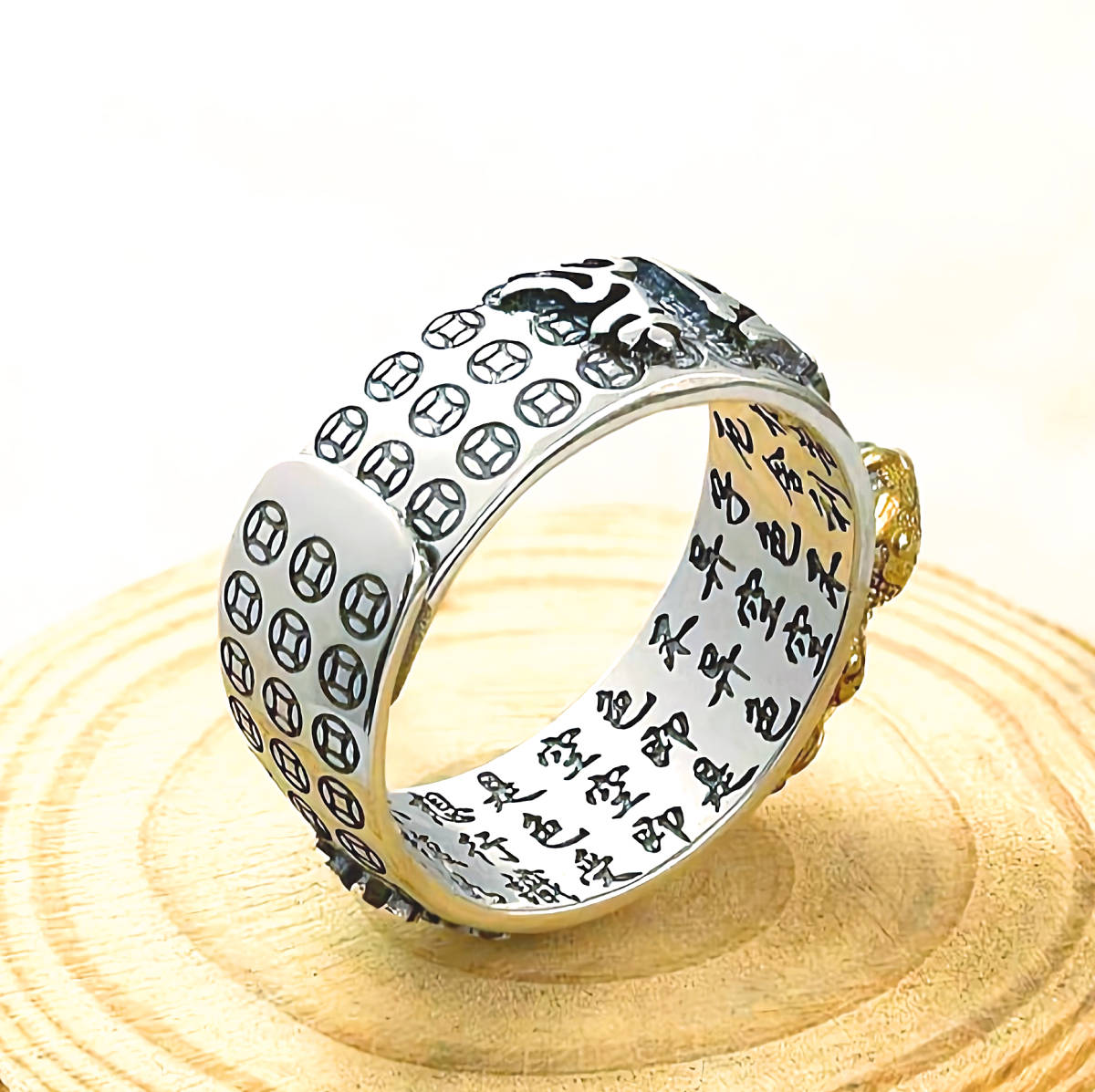 こちら身に着けた者に財運をもたらす、黄金の神獣ヒキュウ般若心境925シルバーリングです。