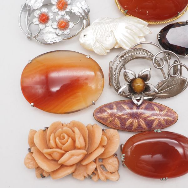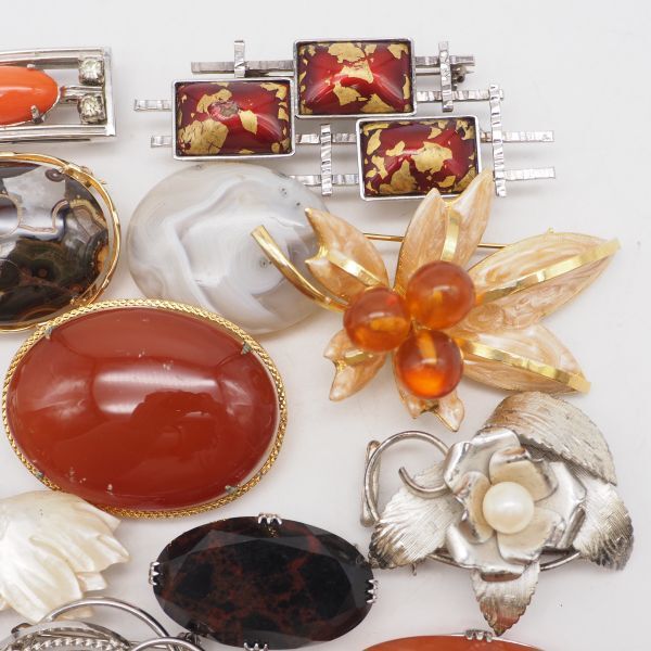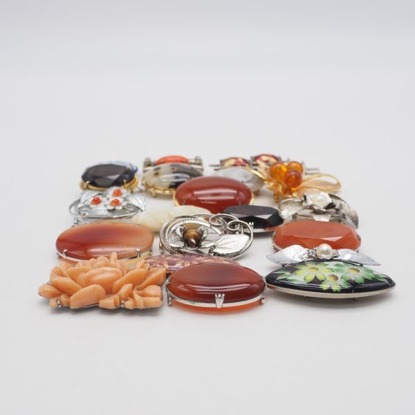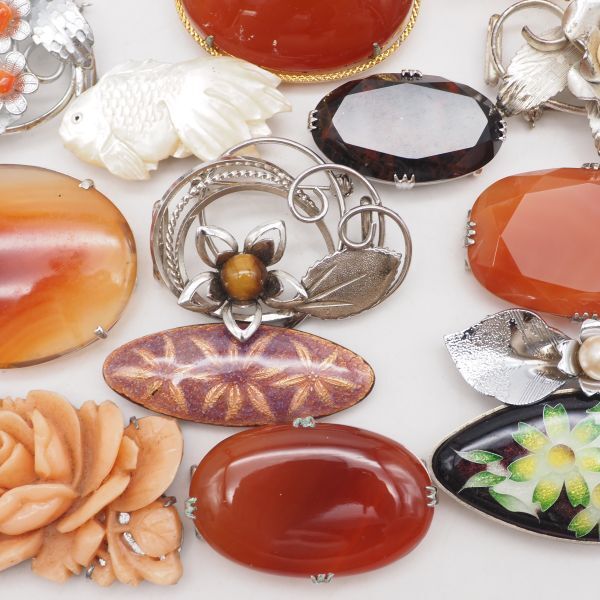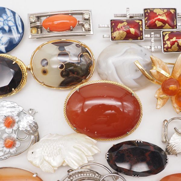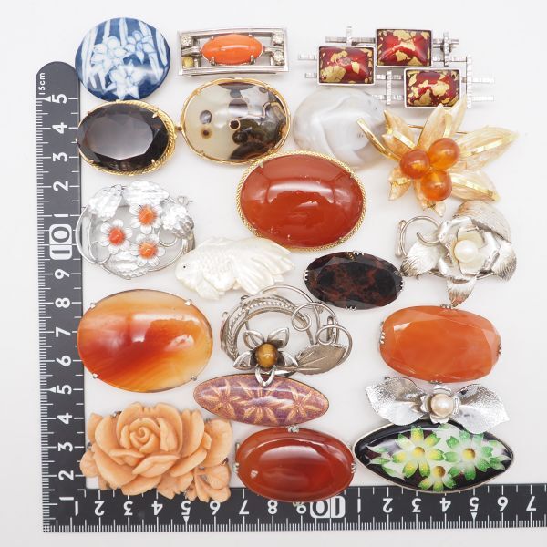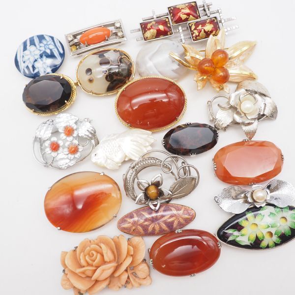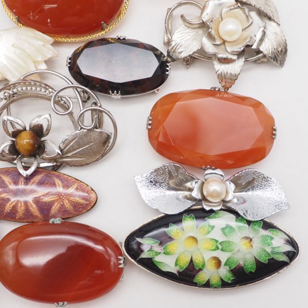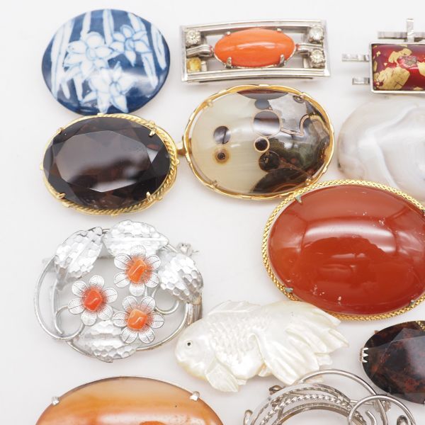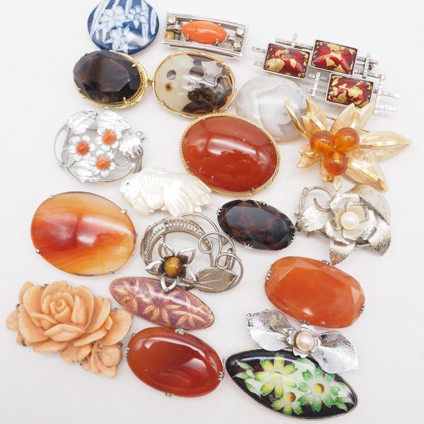 WOB1105) 1円 帯留め 20個 大量セット 七宝 真珠 パール 瑪瑙 メノウ 天然石 シルバー アンティーク 等 まとめて