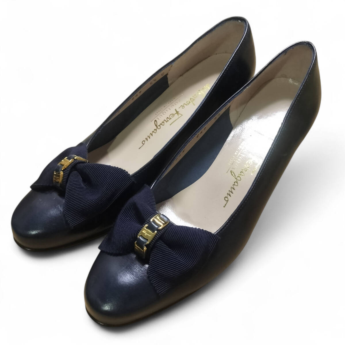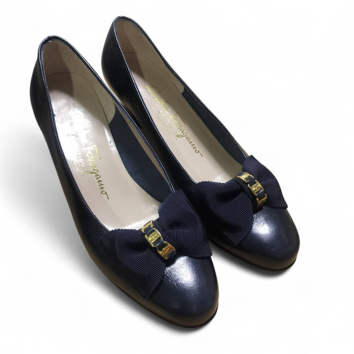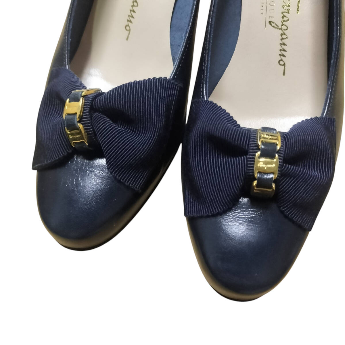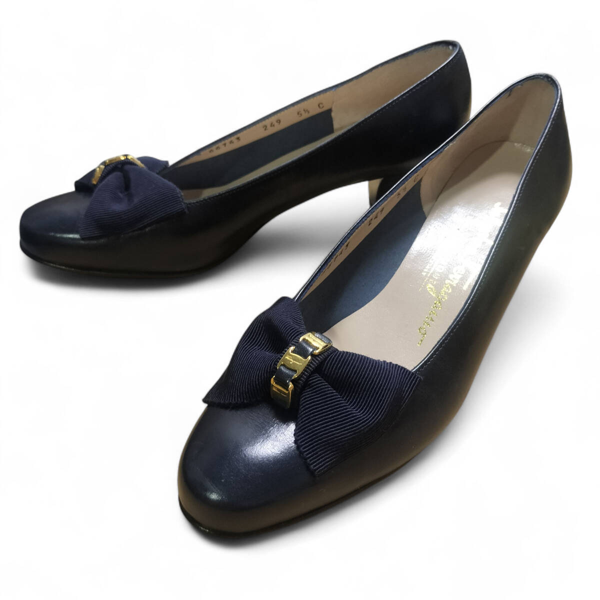 【美品】Salvatore Ferragamo サルヴァトーレフェラガモ フェラガモ パンプス ネイビー 5.5C 22.5cm相当 レザー リボン ガンチーニ