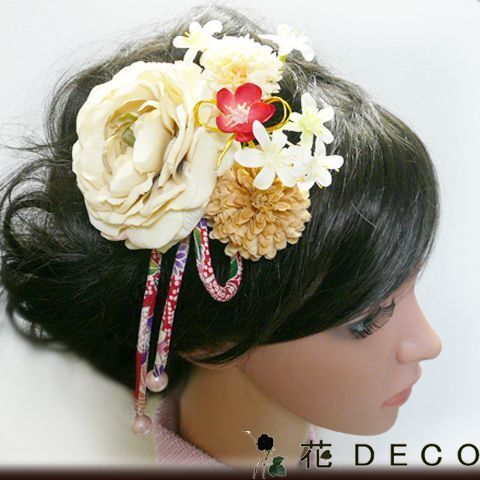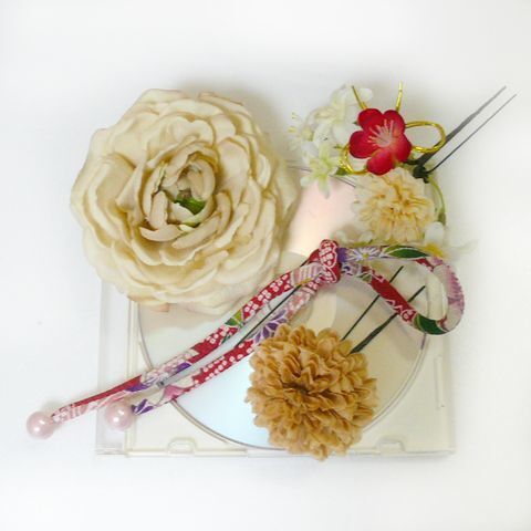 髪飾り 花 金鳳花と菊梅 ベージュ 赤 成人式 振袖 結婚式 卒業式 袴 浴衣 着物 アートフラワー くすみカラー