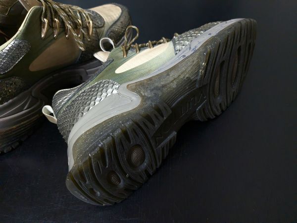 厚みのあるソールにパイソンレザーのコンビが特徴的な一足。