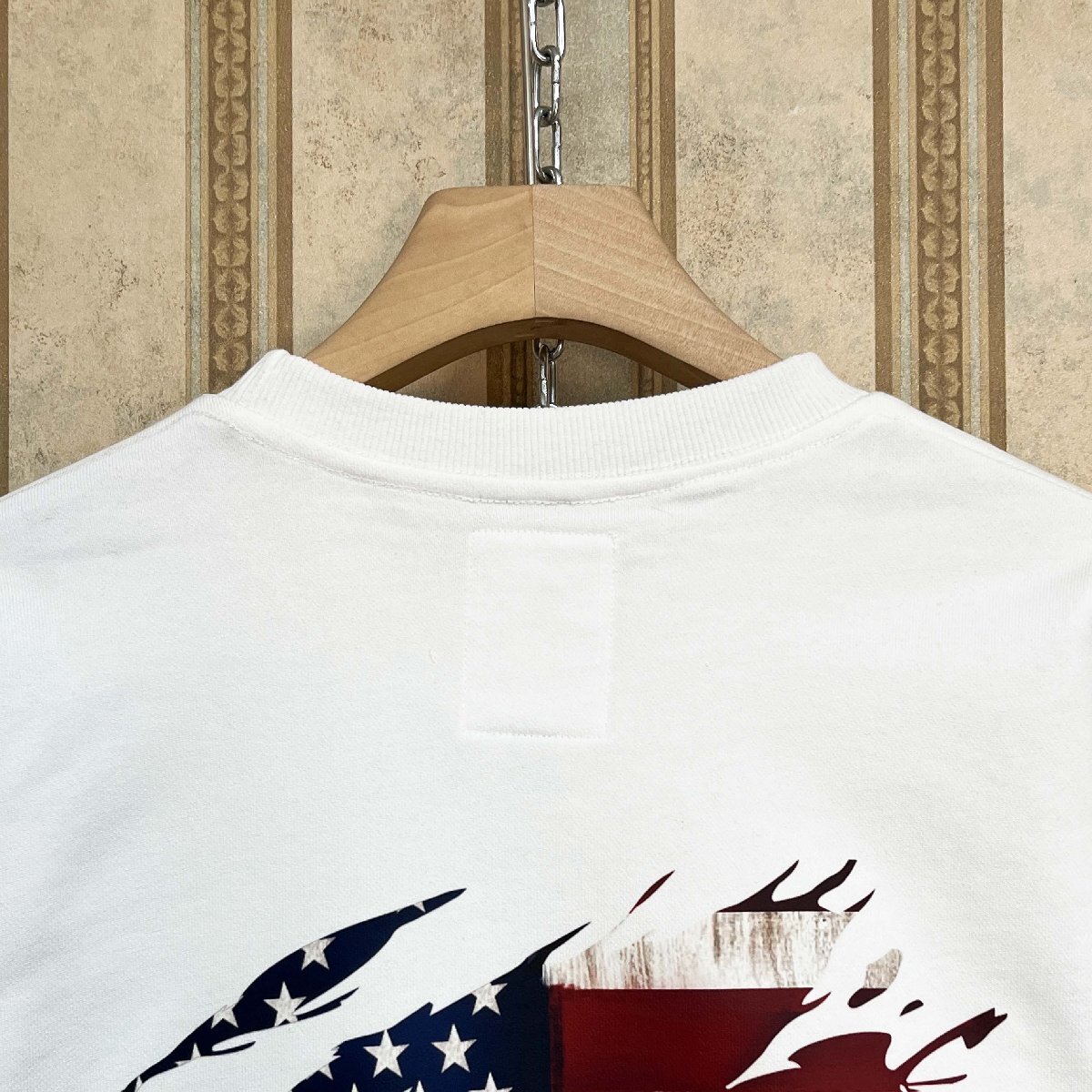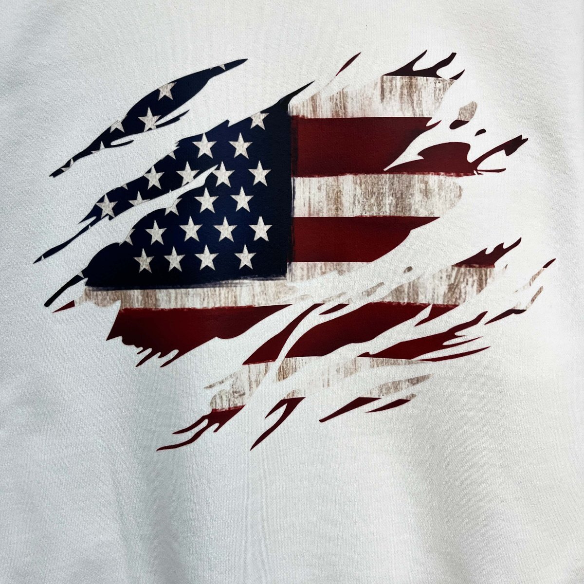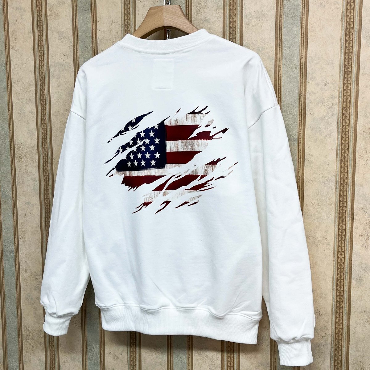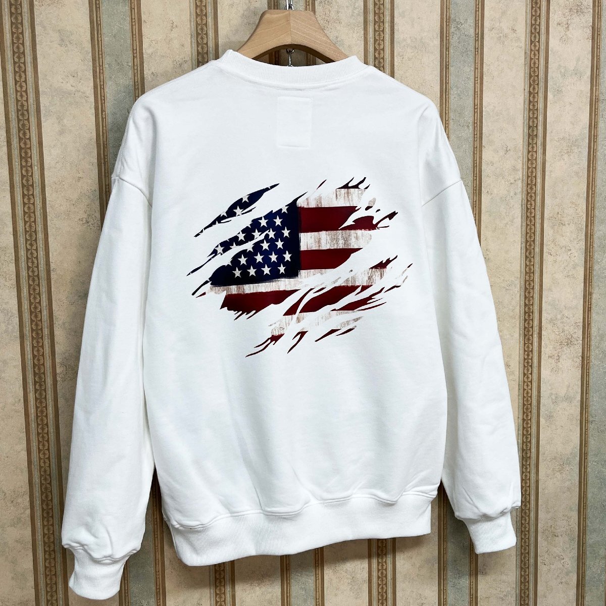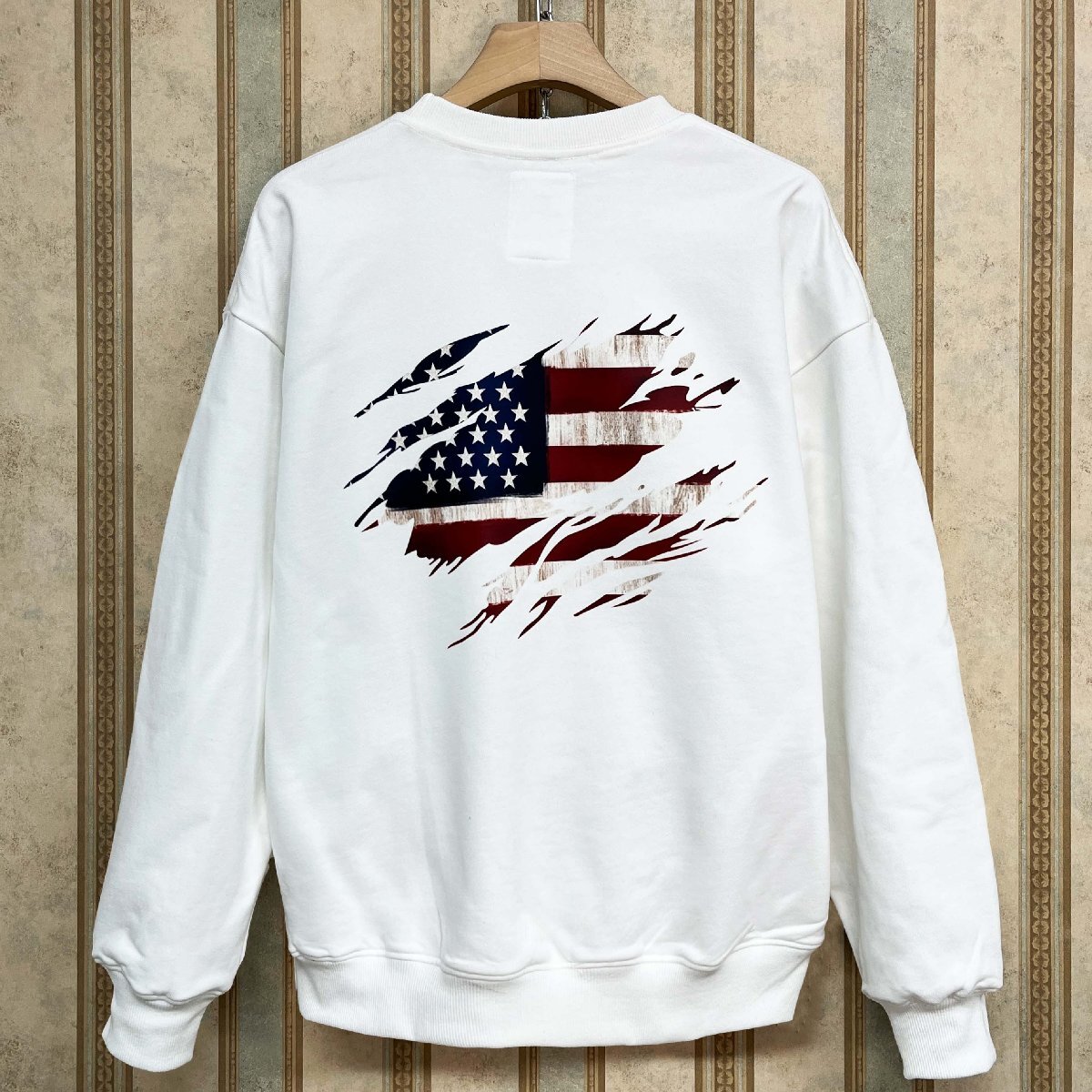 フロントはシンプルで清潔感のある無地デザイン。クラシックなルーズフィットシルエットは体型を選ばず、ゆったりとした着心地で動きやすさも抜群です。背中のユニークなアメリカ国旗プリントが視線を集め、インパクト抜群!