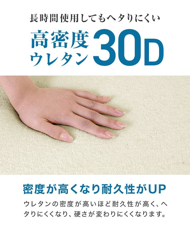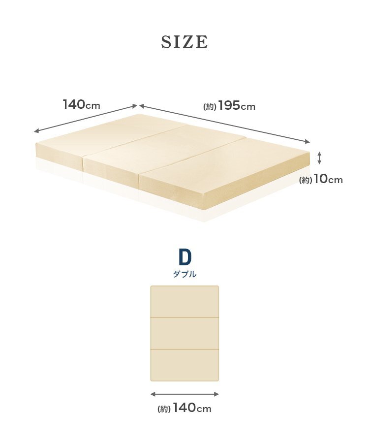 ウレタンの密度が高く耐久性に優れ、長時間使用してもヘタリにくい! 当店のマットレスは適度な反発力と体圧分散性により、理想的な寝姿勢を維持します。 適度な反発力は寝返りが打ちやすく快眠へと導き、スッキリした目覚めを迎えられます♪ 床敷きでも使える厚みたっぷり約10cm! さらに!肌触り抜群な「パイル生地」を使用し、1年中快適です。 三つ折り式なのでサッとたためて収納しやすく、立て置きで湿気対策にも最適! また、カバーは簡単脱着可能なU字ファスナー仕様&洗えていつでも清潔に使えます。 【商品仕様】 カラー:グレー サイズ(約):幅140cm×長さ195cm×厚み10cm(ダブルサイズ) 折り畳み時(約):幅97cm×長さ65cm×厚み30cm 素材:高反発ウレタン 、パイル生地 他 硬さ:210ニュートン ※耐熱仕様ではございませんので、電気毛布との併用はおやめください。 (ウレタンマットレス 高反発マット マット ベットマット マットレストッパー 3つ折り 洗える カバー 体圧分散 シングル セミダブル ベッド 敷き布団 寝具 210N 人気 おすすめ WEIMALL) |