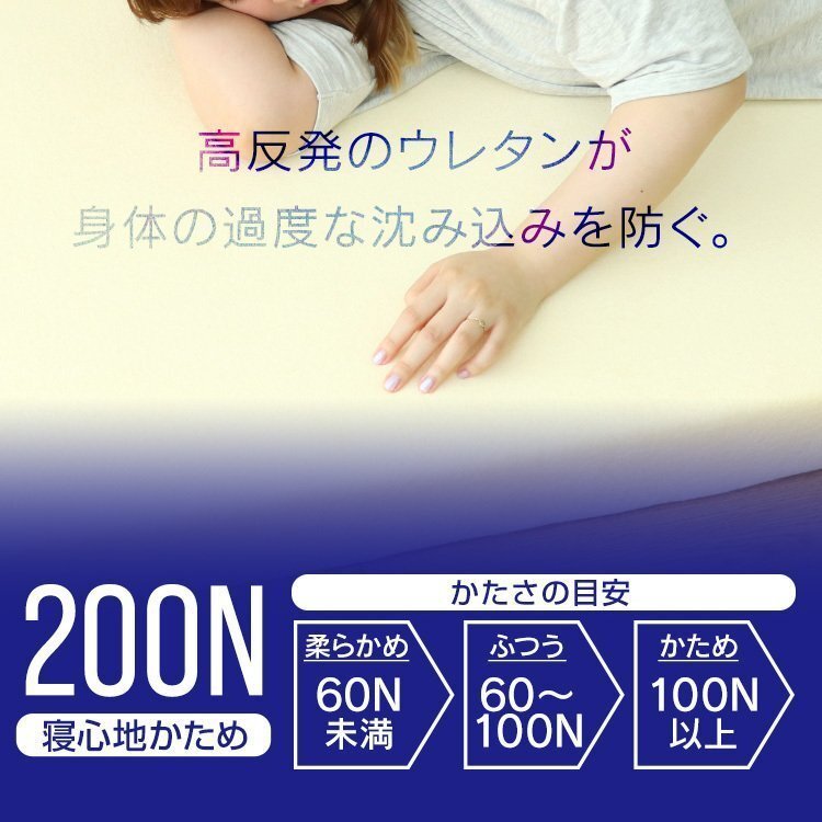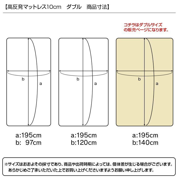 | 高密度30D!こだわりの硬さ200N! 厚みたっぷり10cm! 適度な硬さで身体をしっかり支える、高反発マットレスです。 柔らかいマットレスとは違い、身体の沈み込みを軽減した腰に優しい寝心地です。 高反発マットレスのウレタンフォームは弾性が高く、適度な硬さで身体を支えるので、底つき感もなくへたりにくいマットレスです。 寝返りが多い方や仰向けに寝ることが多い方におススメです。 取り外しやすいL字ファスナー付き洗えるカバーが付属しています! 【商品仕様】 カラー: ベージュ サイズ(約):幅140cm×長さ195cm×厚み10cm(ダブルサイズ) 梱包サイズ(約):75×36.4×36.4cm 重量(約):9.9kg 素材:高反発ウレタン(密度30D(30kg/m3)) 、パイル生地 他 硬さ:200ニュートン ※耐熱仕様ではございませんので、電気毛布との併用はおやめください。 |