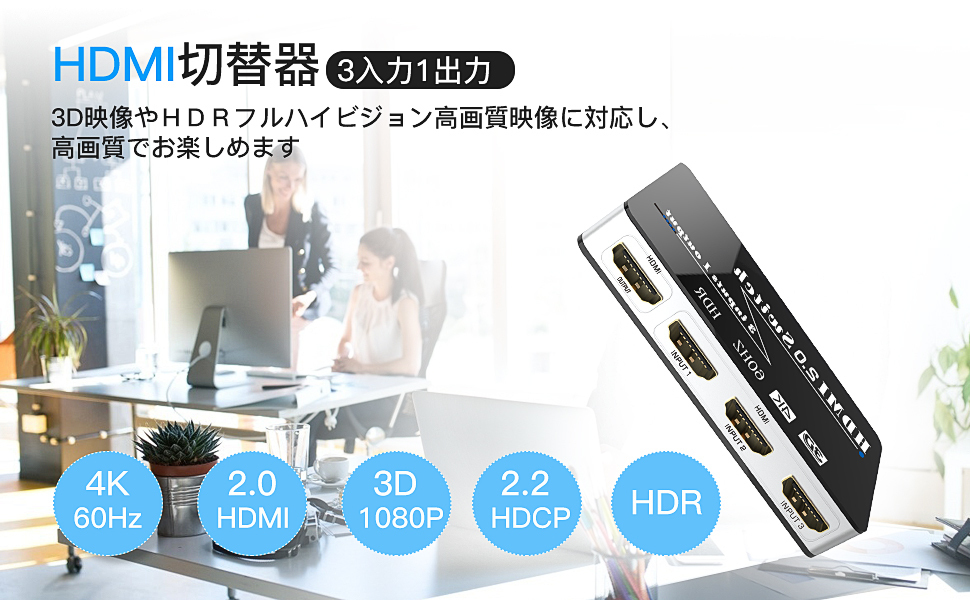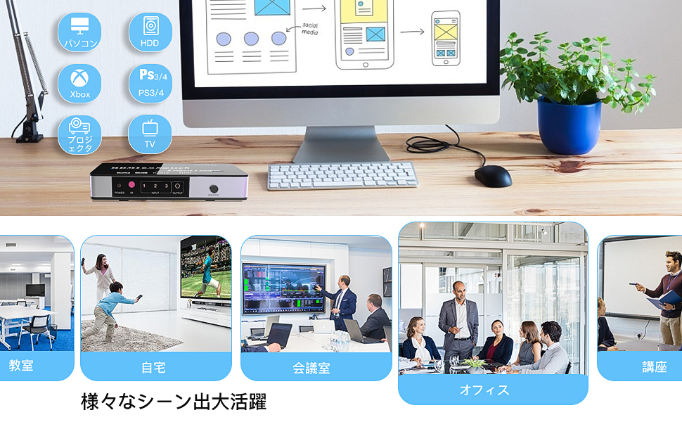 入力:XBox 360、XBox One、PS4 / PS5、Pro、ゲーム機、Blu-Ray DVDプレーヤー、Chromecast、PCなど。出力:テレビ、HDTV、ディスプレイ、モニター、プロジェクターなど。