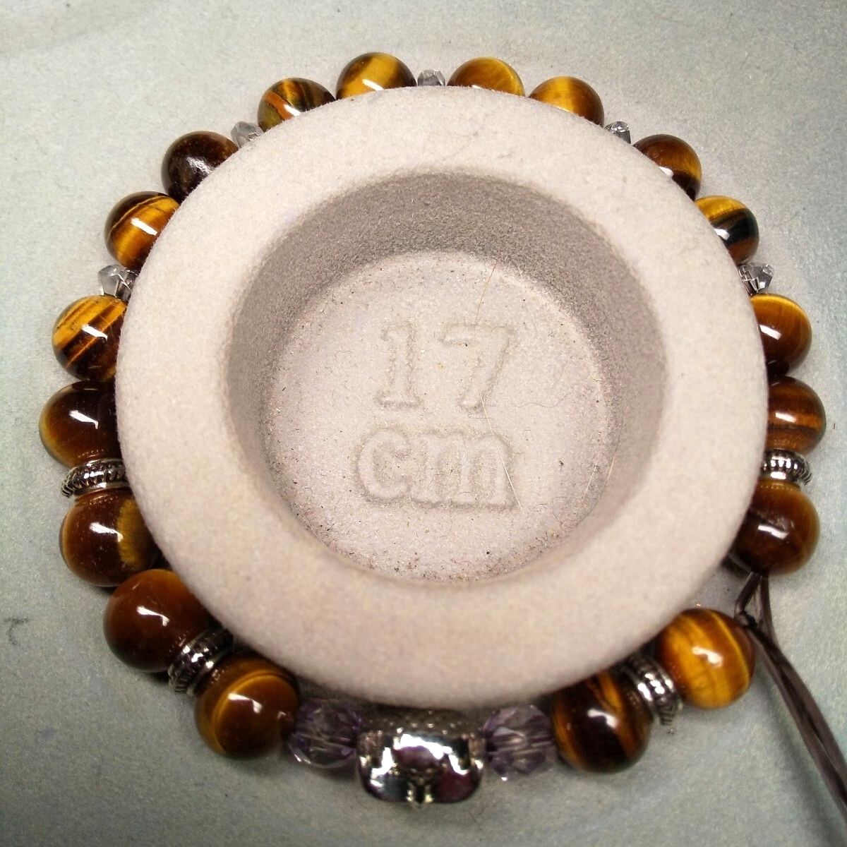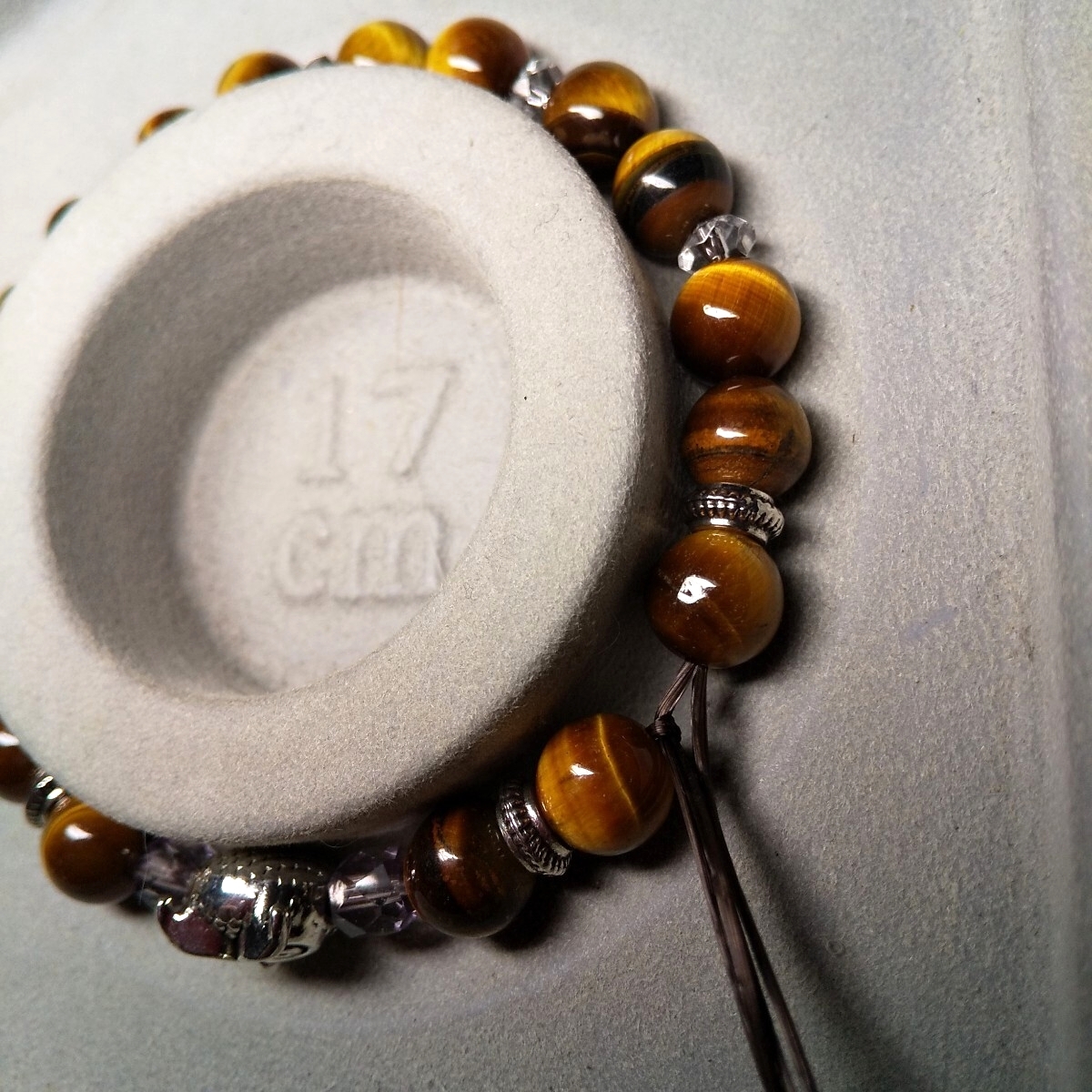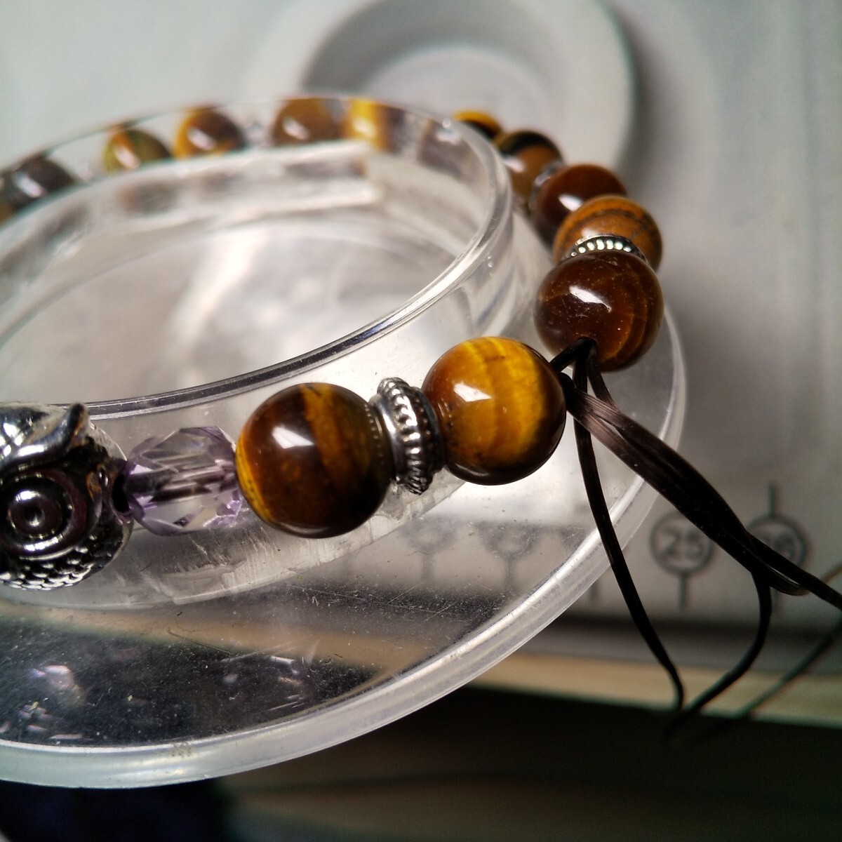 タイガーアイA相当? のタイガーアイ2粒おきに水晶ボタンビーズのロンデルと、非鉄合金のロンデルとを入れました。