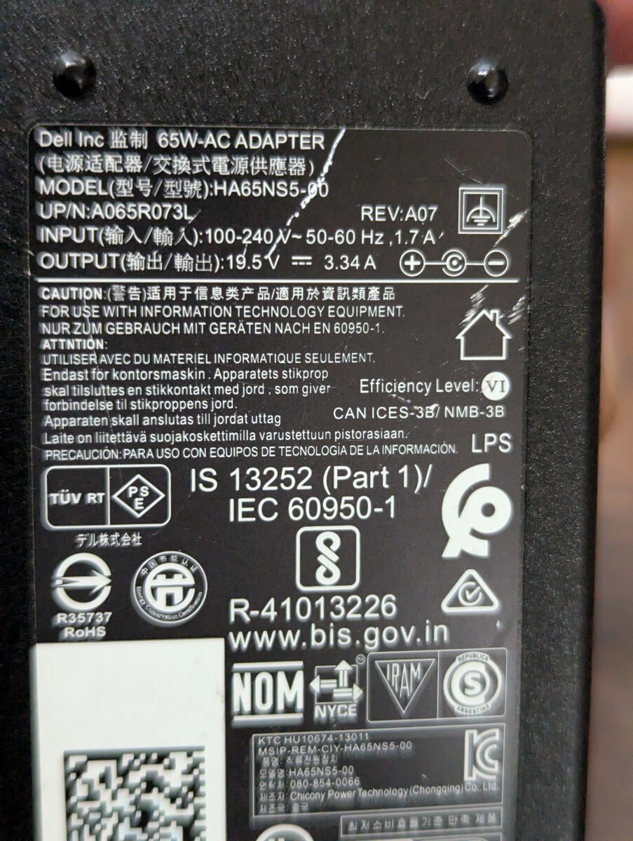 DELL 純正 65W 19.5V3.34A ACアダプタ- HA65NS5-00 / 丸ピン4.5㎜コネクター