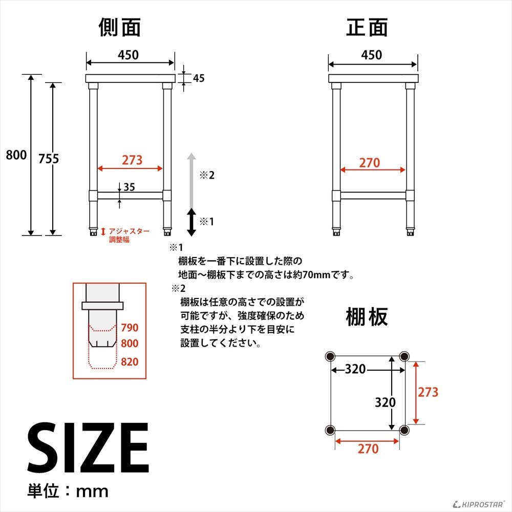 | 材質 | 天板:ステンレスSUS430 脚:ステンレスSUS201 梁:スチール アジャスト脚:ステンレスSUS201/PVC |