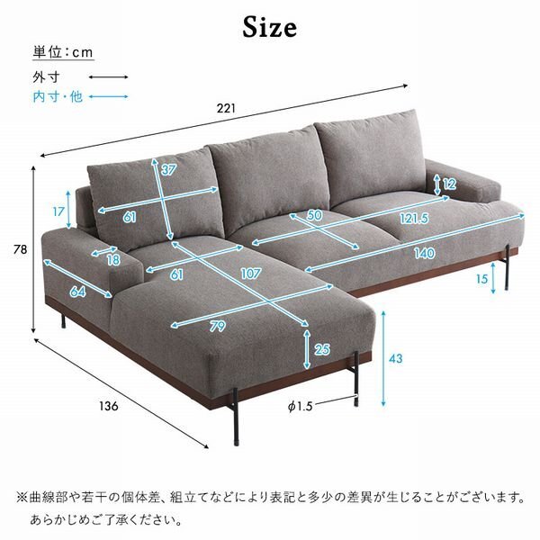 【カラー】 ベージュ、グレー 【サイズ】 W221×D136×H78cm(SH43cm) 【重量】 73.4kg 【素材】 張材;ポリエステル100% クッション材:ウレタンフォーム、鋼製バネ 構造部分:天然木 脚部:金属(スチール) 【梱包】2梱包でお届けします。 2-1 サイズ:W140×D79×H36cm 2-2 サイズ:W142×D80×H36cm 重量:2個口合計 77.5kg 【組み立て品】 お客様による組み立てが必要です。 【ご注意】 ・サイズ、重量は概算です。 ・商品カラーはご使用のモニターによって実際の明るさや色と異なって見える場合がございます。 |