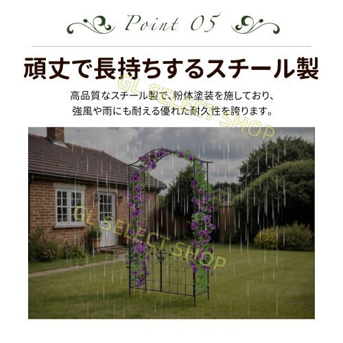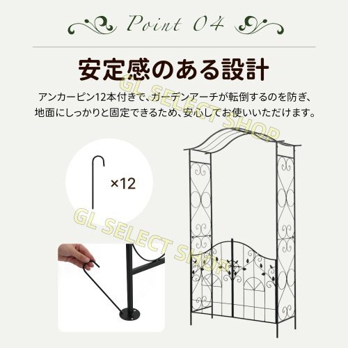 • ◎04 【安定感のある設計】アンカーピン12本付きで、ガーデンアーチが転倒するのを防ぎ、地面にしっかりと固定できるため、安心してお使いいただけます。