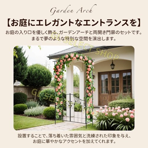 • 【お庭にエレガントなエントランスを】お庭の入り口を優しく飾る、ガーデンアーチと両開き門扉のセットです。設置することで、落ち着いた雰囲気と洗練された印象を与え、お庭に華やかなアクセントを加えてくれます。
