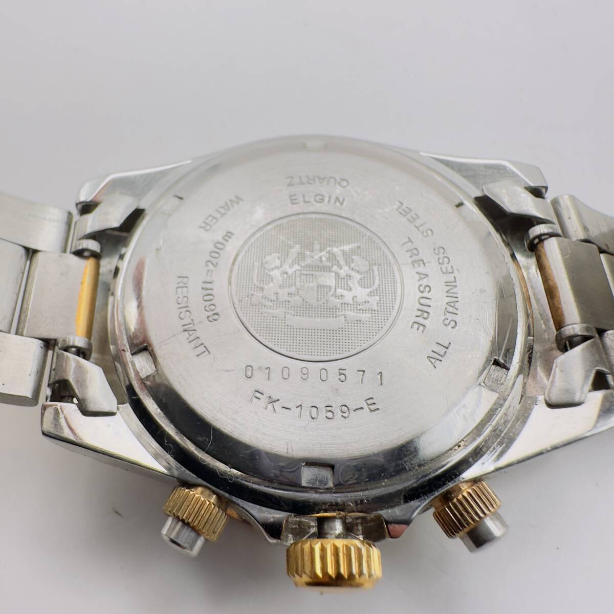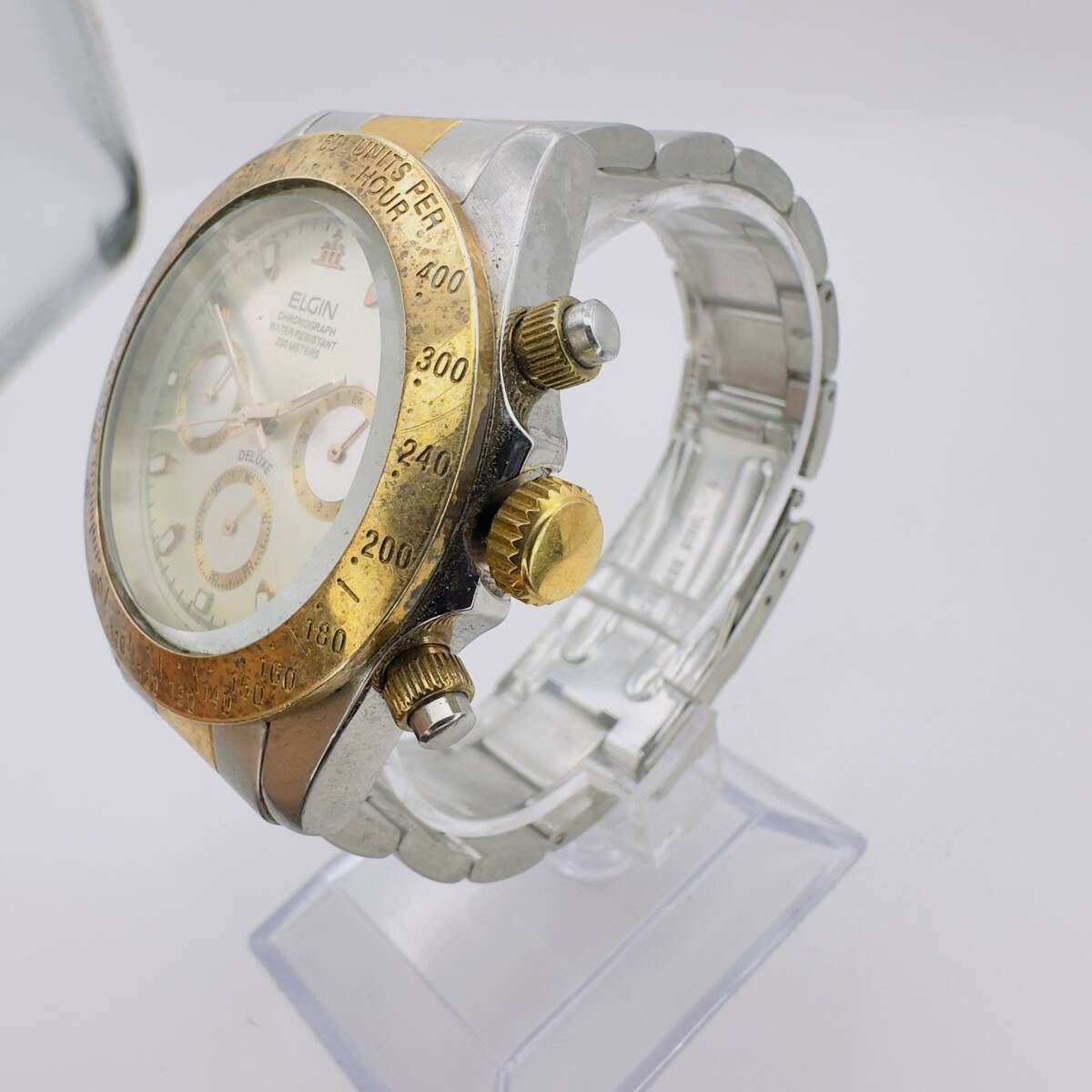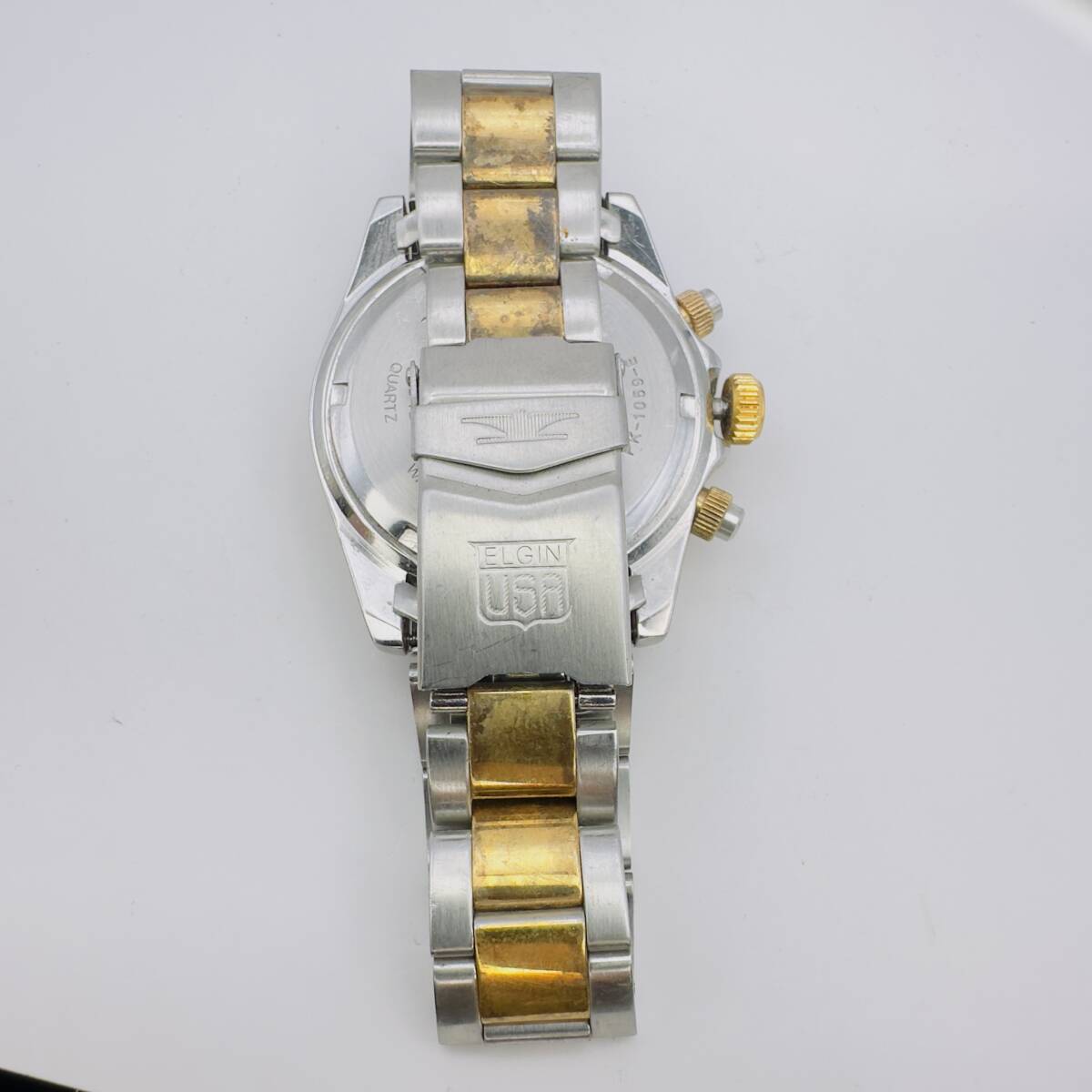 こちらは ELGIN CHRONOGRAPH DELUXE(型番 FK-1059-E)のモデルです。40mmのしっかりとしたサイズ感に加え、ゴールド×シルバーのコンビデザインが特徴的で存在感のある一本です。