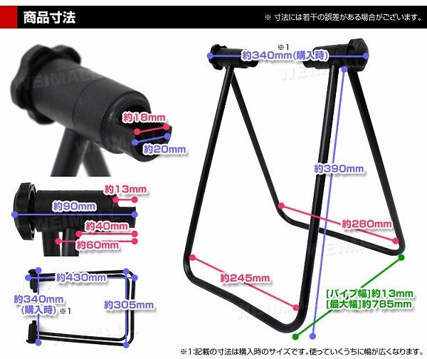 後輪に取付けする自転車用スタンドです。 ロードバイクやクロスバイクなどでスタンドを付けていない場合に便利です! 取付けは簡単!! リヤハブに挟み込むようにして取付けするだけ。 ディスプレイとして部屋に自転車を 置く時・飾る時や、自転車の修理時などに大活躍!! 使わないときはコンパクトに折りたためるので、収納場所にも困りません♪ □商品詳細□ 折りたたみサイズ(約):430mm×305mm 対応ハブ幅(約):130mm〜160mm 重量(約):710g カラー:ブラック □注意事項□ ・使用時の破損や事故等につきましては責任を負いかねます。 ・輸入品の為、本体にキズ、汚れ、箱潰れがある場合がございますが、新品商品です。 ・仕様・デザインは改良のため予告なく変更することがあります。 |