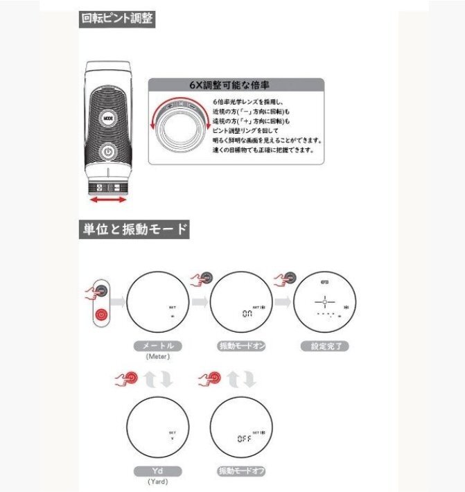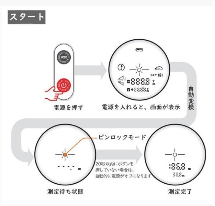 機能モード:直線距離モード、スロープモード、ピンロックモード、スピード測定モード、高低差補正機能