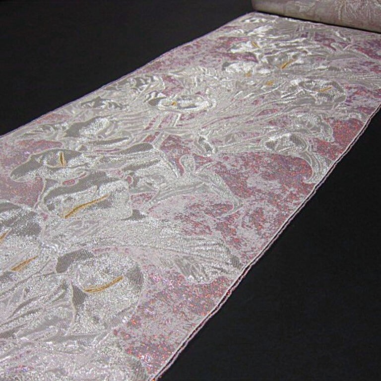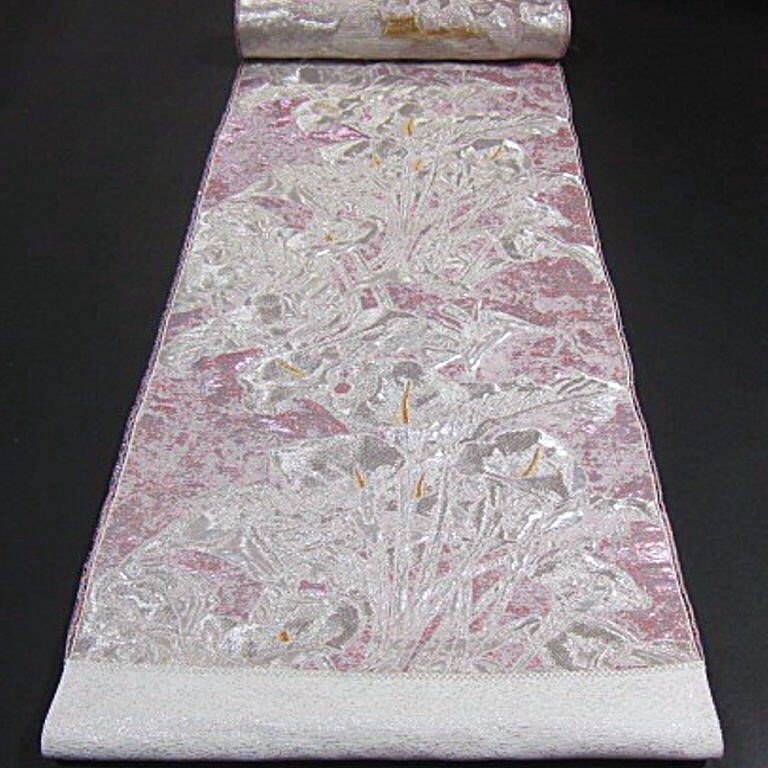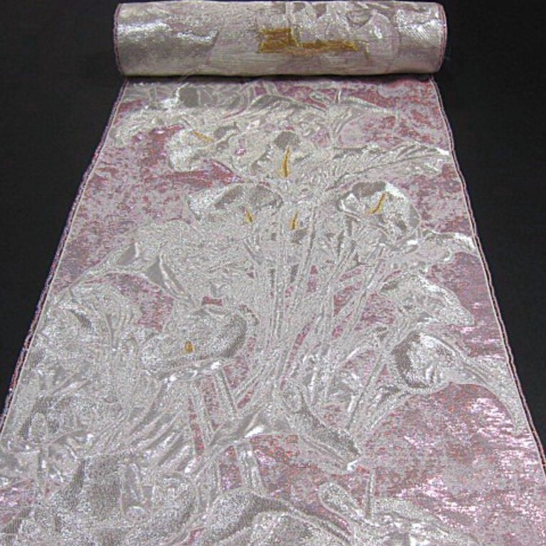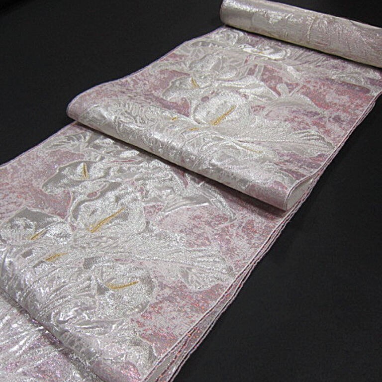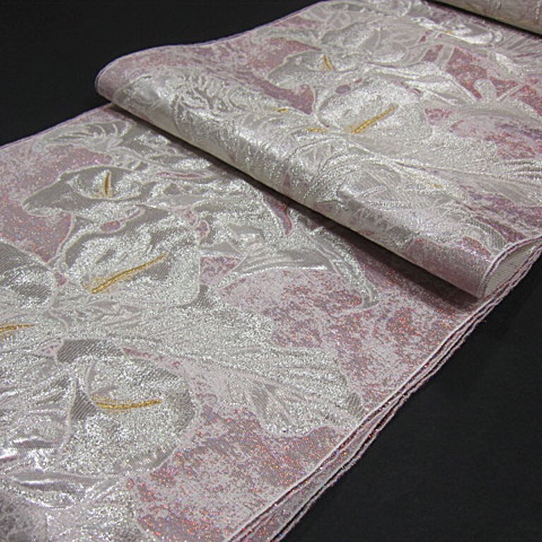 新品未仕立 西陣織六通柄丸巻袋帯です。 カラーの花の意匠がエレガントに織り上げられた素敵な帯です。大人女性の装いに相応しい一品。訪問着、色無地、小紋、付下げと、お使いいただけるかと思います。お出かけ・パーティー・観劇などにいかがでしょうか。こちらですが、丸巻の袋帯の為裏地などは、ついておりませんのでその点ご了承の上ご入札ください