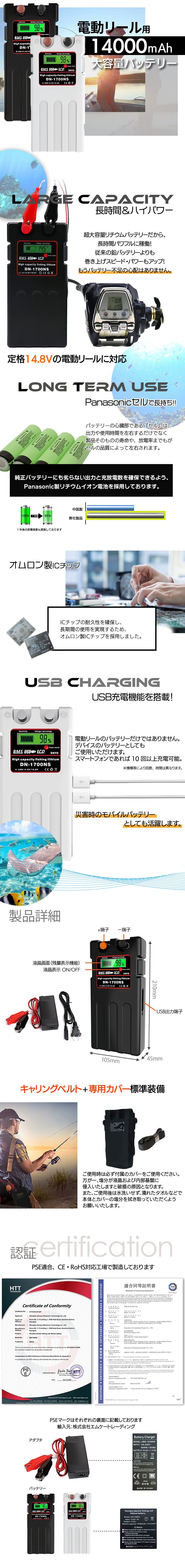 型番:DN-1700NS 認証:PSE・CEマーク取得済 容量:14000mAh 電圧:定格14.8V/最大16.8V サイズ:213mm×104mm×45mm 重量:約1.5kg 機能:保護回路・過電流保護・過充電防止・過放電防止 付属品:バッテリー本体、カバー、充電器 対応品:定格14.8V/最大16.8Vが対応している電動リール |