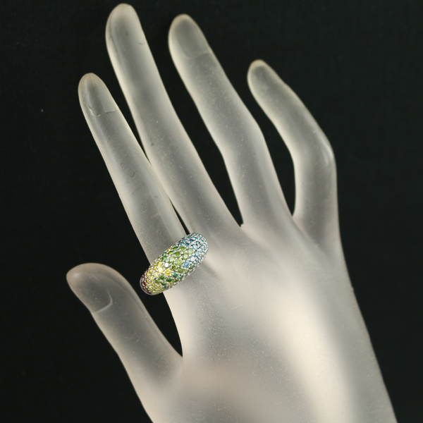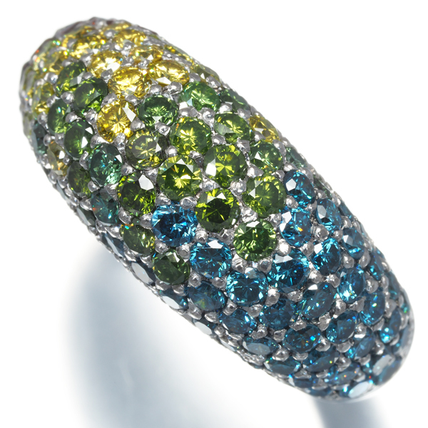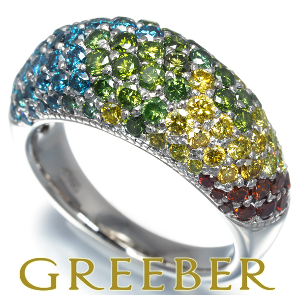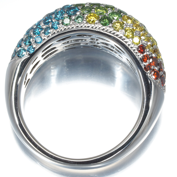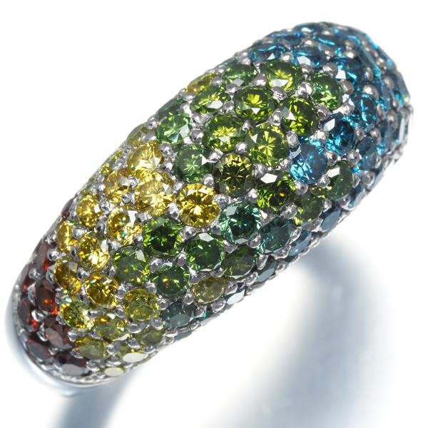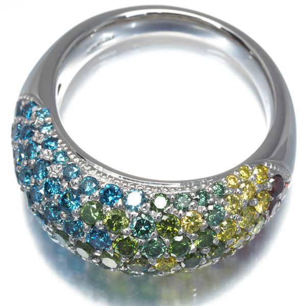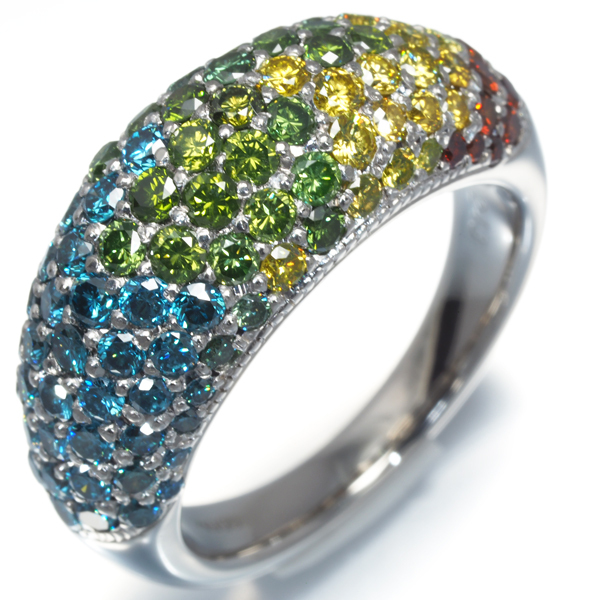 ブルー、グリーン、イエローそしてオレンジの4カラーダイヤモンドがお手元に華やかな輝きと彩を与えてくれるプラチナジュエリー。眩いテリと共に瑞々しい透明感を持つ1石1石の色彩豊かな煌めきがお手元に素晴らしいアクセントを与えてくれそうですね。 |