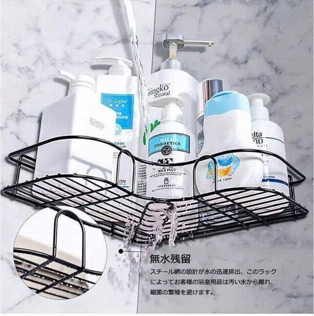 【ステンレスバスラック】 この収納ラックはステンレス製で、おしゃれな金属光沢が溢れ、見た目がキレイです。 防サビ性はもちろん、耐腐蝕性?耐久性もいいです。いつも濡れた浴室?油一杯のキッチン等に取り付けても真新しい状態を持ち続けます。 【省スペース】 風呂コーナーラックとして、90度コーナーに取付けてよく壁?コーナーの空間を利用します。 人間の活動に邪魔にならなく、隅のスペース最大利用できる壁掛け棚です。 【しっかり壁に掛ける】 強力テープが付き、穴あけ?ネジ止め不要でお風呂ラックが簡単に取り付けます。 耐荷重は5kgまで、家族全員のシャンプー?洗顔用品等を置いてもご安心してください。