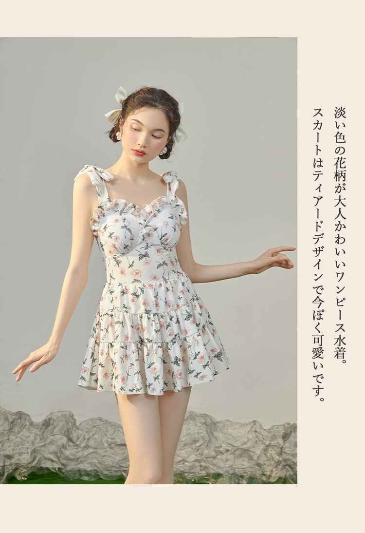 ・淡い色の花柄が大人かわいいワンピース水着。伸縮性抜群でノンストレスな肌心地です。