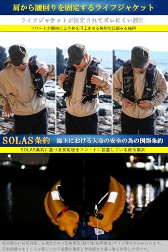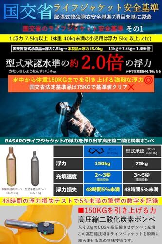 こちらのライフジャケットは国土交通省のライフジャケット設計基準に基づき設計を行っている製品になります。※国土交通省型式承認品ではございませんので、船舶法廷整備品には適合しておりません。また自動膨張式のライフジャケット ベルトタイプのライフジャケットよりも大きいフロートを搭載しておりマックスの浮力は150Nになっております。首掛け式ライフジャケットはフロートが人間の肺の位置でフロートが膨張する為、水中では安定した浮遊ができます。ライフジャケットの性能:最大浮力150N/24h 自動膨張装置 膨張用ボンベ33g レンジャーホイッスル搭載