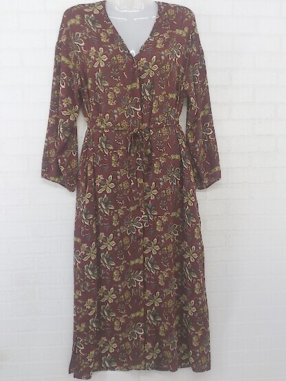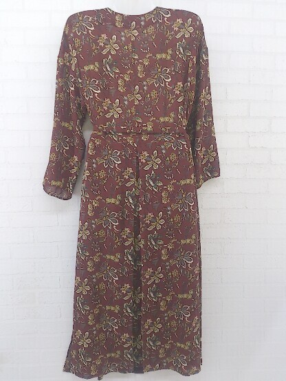 ◇ ◎ liflattie ships 総柄 Vネック 長袖 膝下丈 ワンピース バーガンディ マルチ レディース P