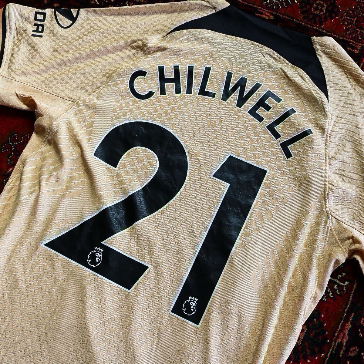 CHELSEA FCのCHILWELL選手の21番シャツ、ベージュカラー、Nike製。
