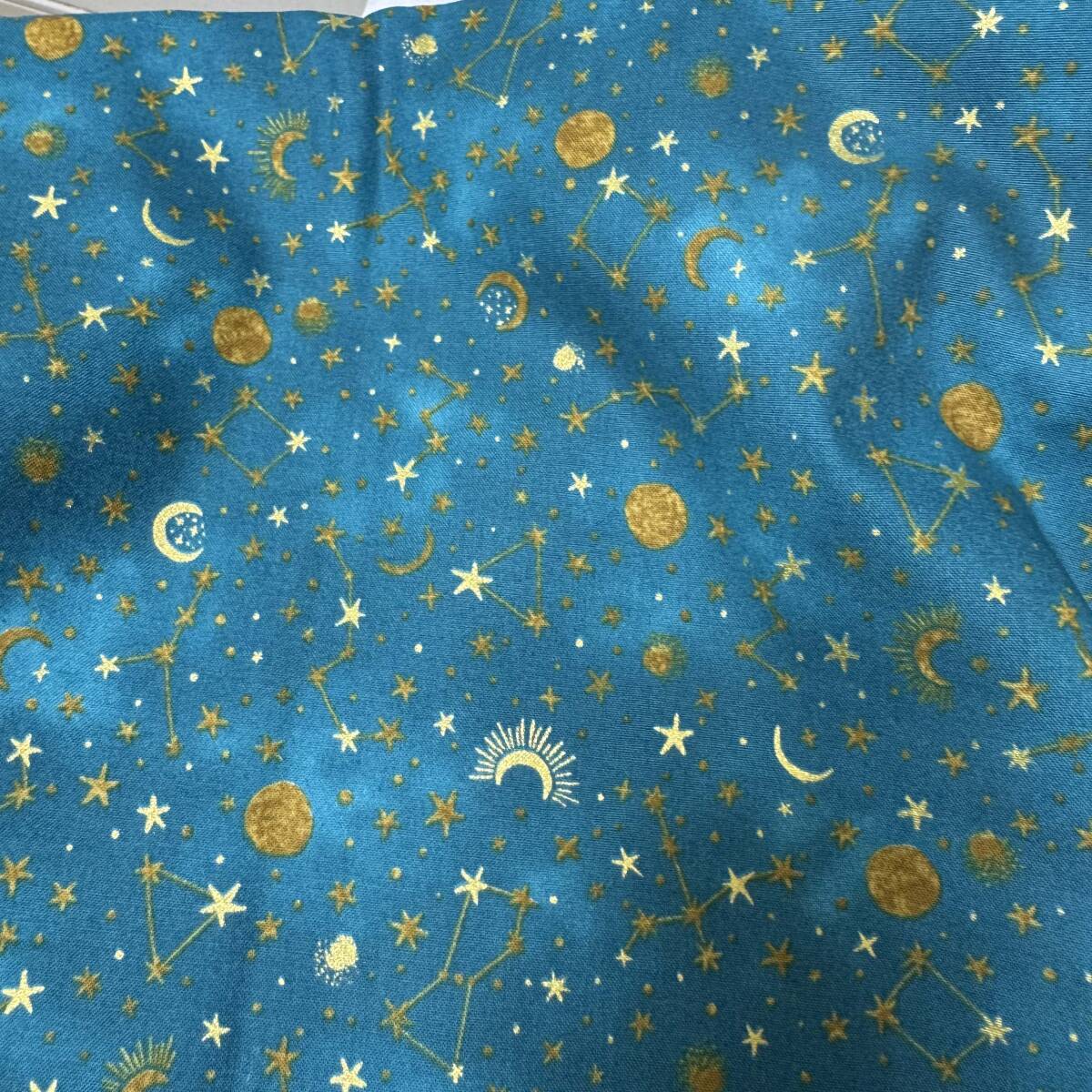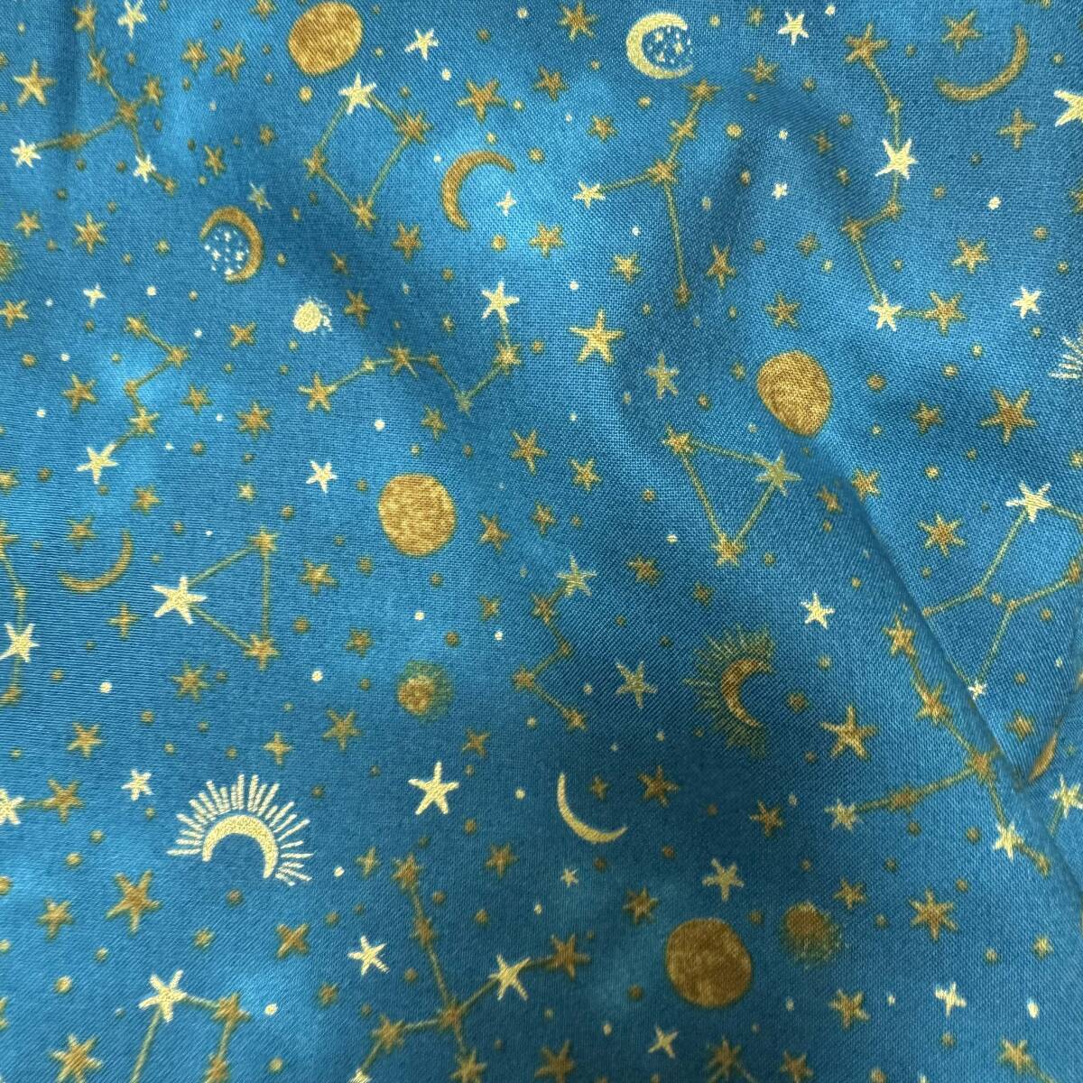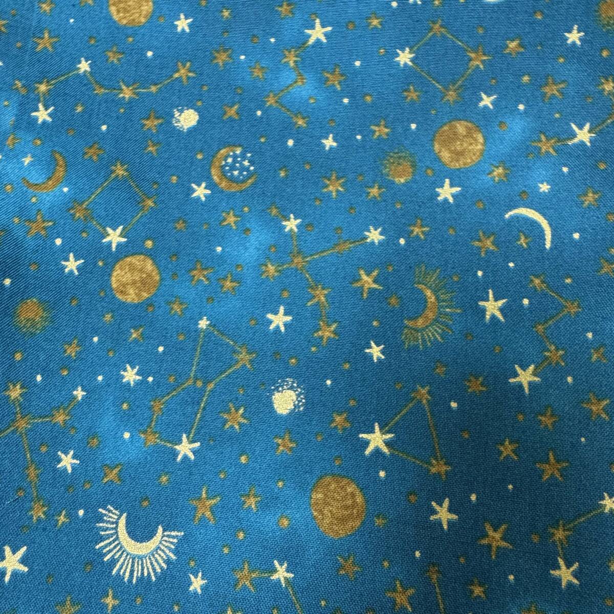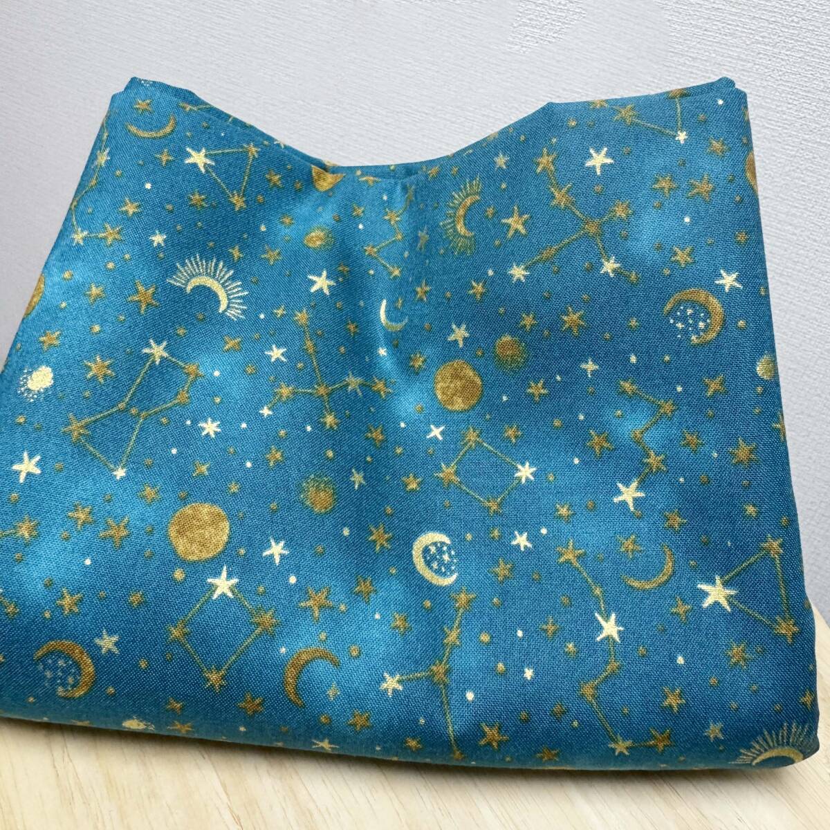 綿シーチング宇宙柄★月★星★星座★はぎれ布ニュアンスブルー生地50c銀河ラメ
