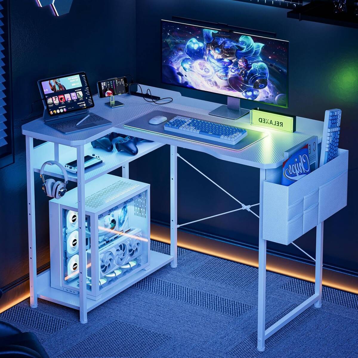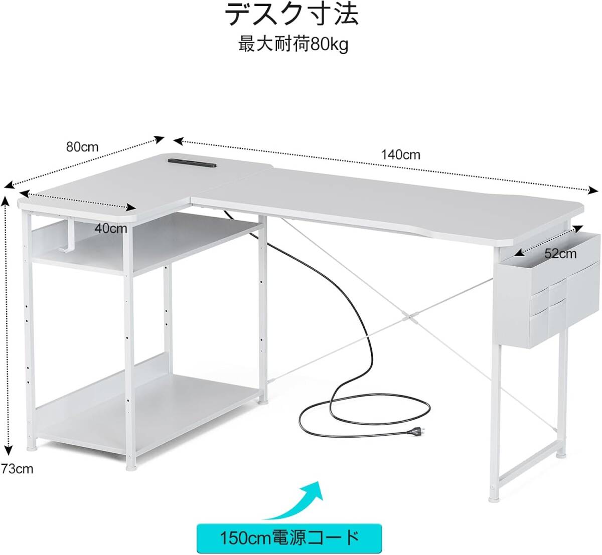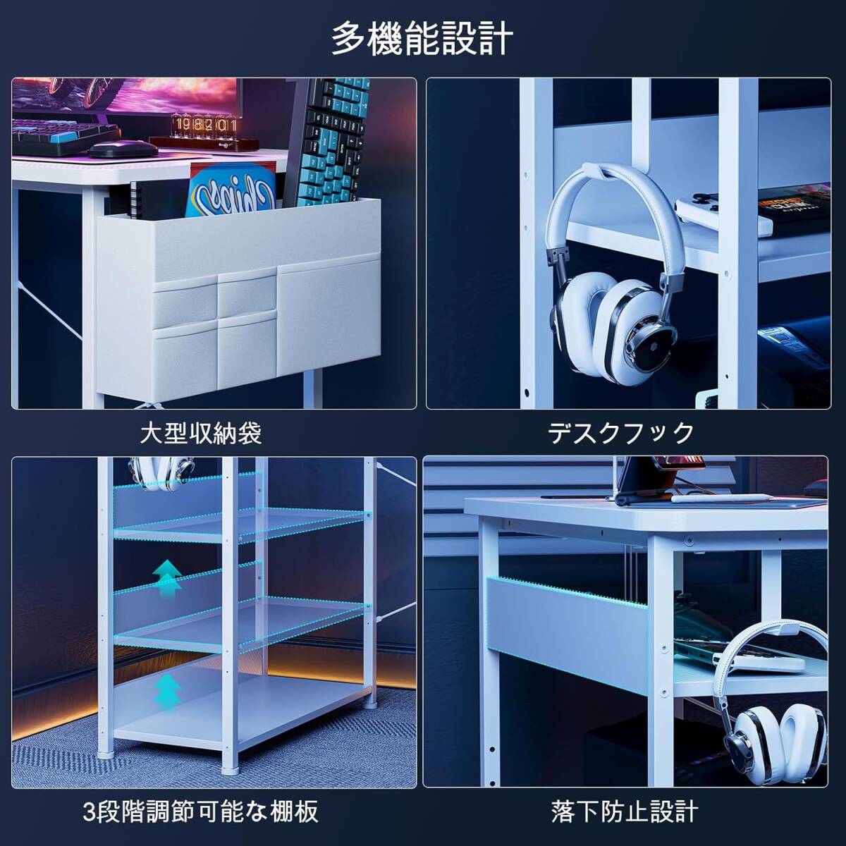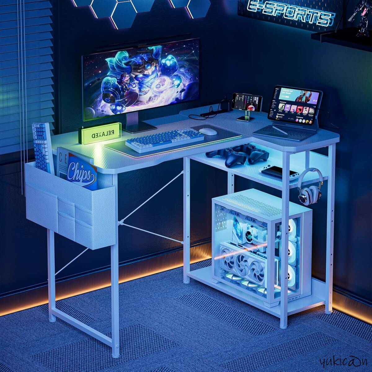 ゲーミングデスク L字デスク 白カーボン板 左右入替OK 収納バッグ付き コンセント付き 幅140 m 棚高さ調節可能 棚付き ゲームワークデスク