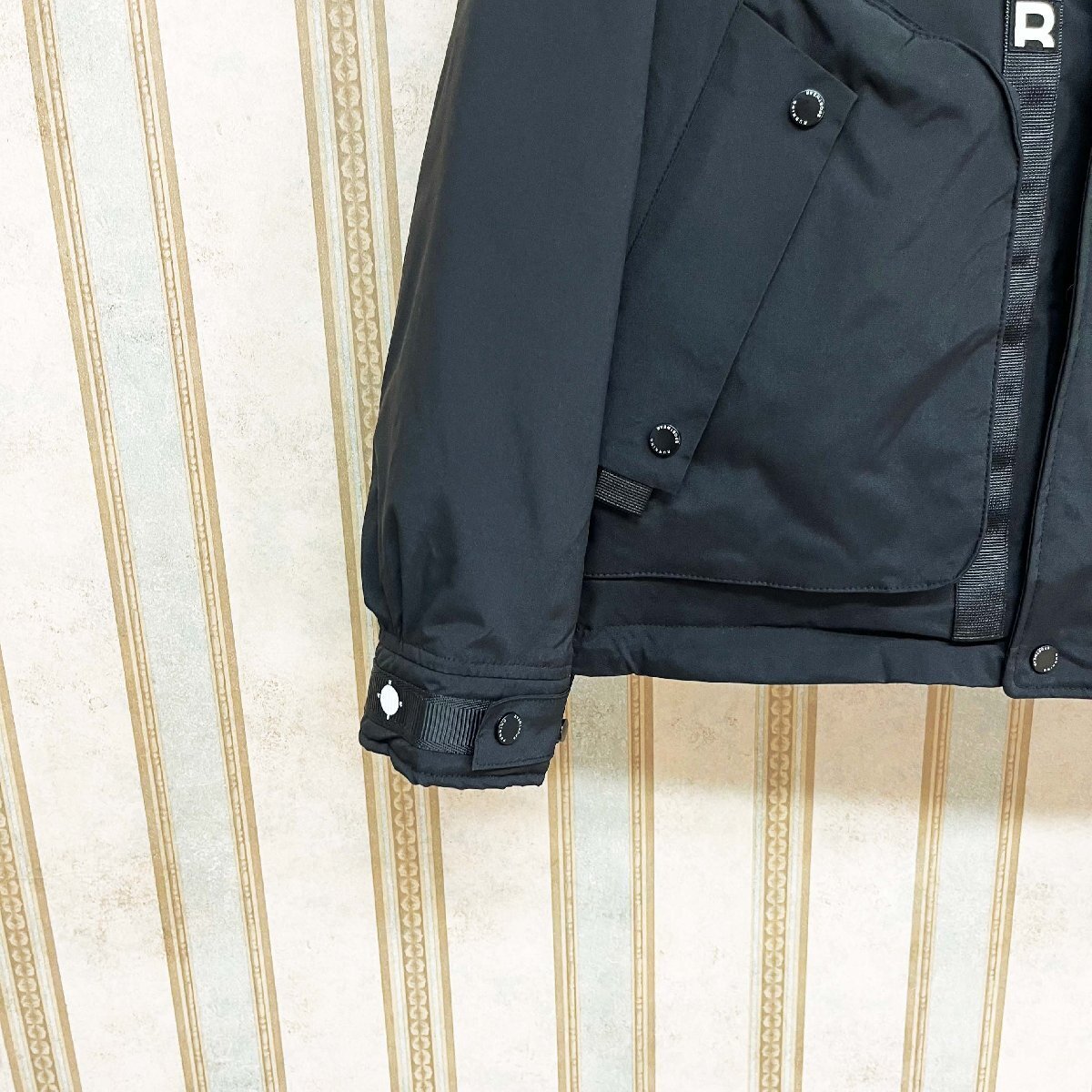 ダウンジャケットと一体のフードと裾には、ドローストリングが付いており、引き締めることで寒風の侵入を防ぐことができます。両サイドには大容量のジップポケットがあり、収納力が抜群です。内側には隠しポケットもあり、貴重品を安心して収納できます。左袖とバックの英字はポイントで、カジュアルスタイルがこなれ感のある印象に。