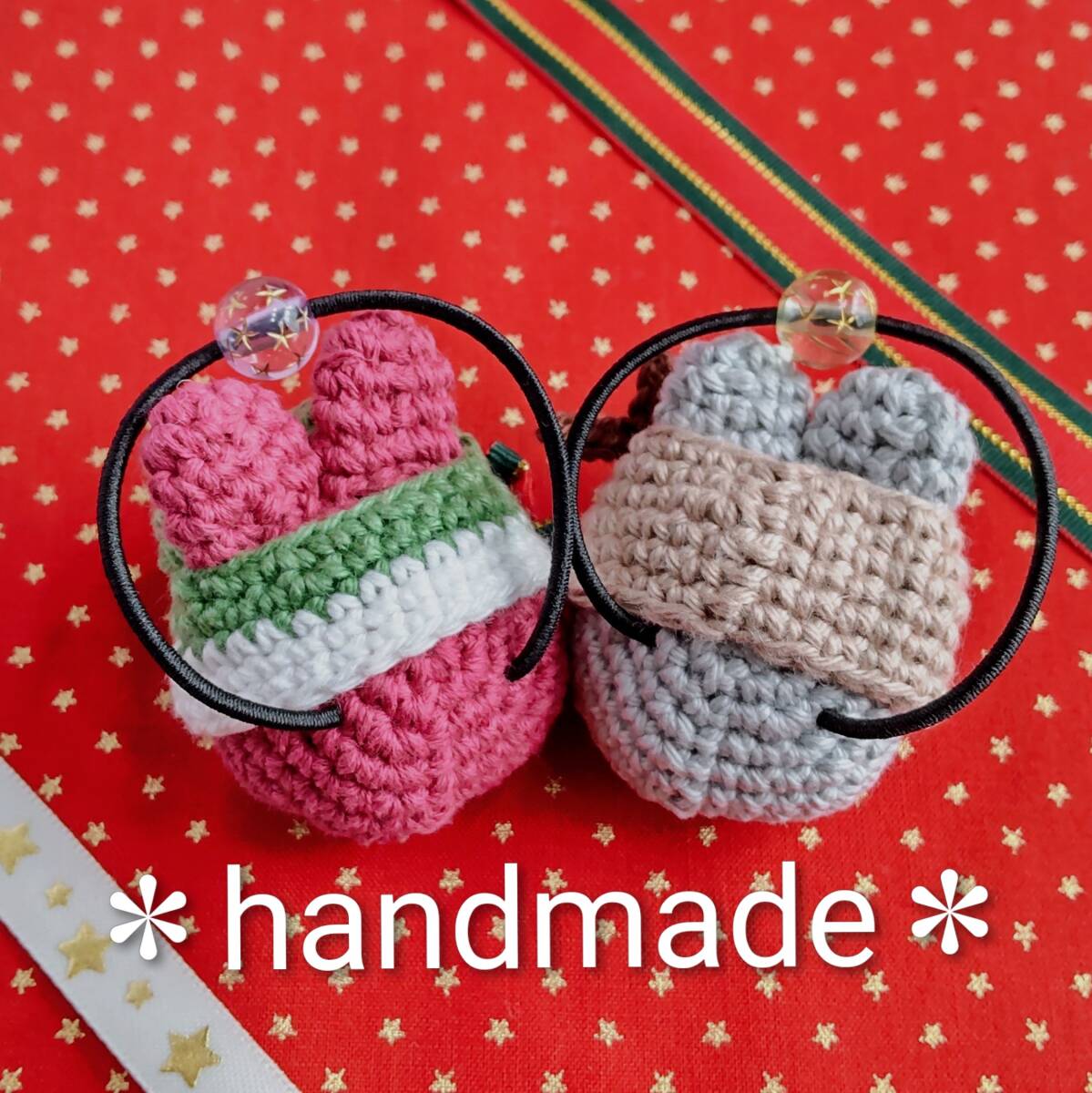 ハンドメイドの編みぐるみヘアゴム2個セットです。
