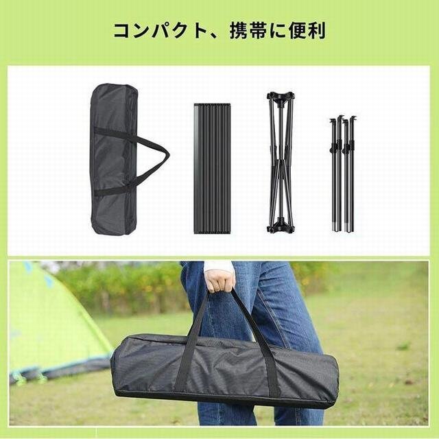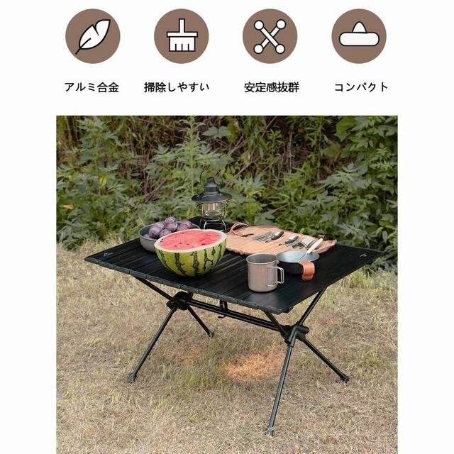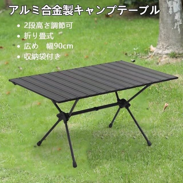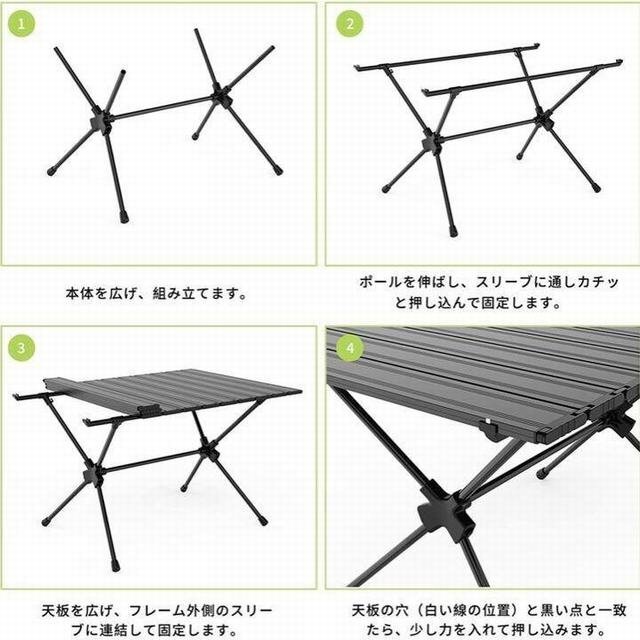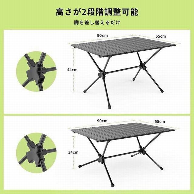 【サイズ】掲載サイズ表をご参照ください。 【アルミ合金7075】 アルミ合金7075が使用したテーブルです。高耐荷重です。 天板には上質なマツト仕上げのアルミ素材を使用していて、断熱性にも優れています。繋ぎ部分はりベットを使用しているので劣化しにくく、丈夫で安定感も抜群です。 【高さは2段階調整可能です】 初代モデルから改良が加えられ、二代目となる本商品は、2段階で調整できるようになりました。アウトドアで使用する以外に、室内での使用にもオススメです。カラーは高級感を出すためにブラックを採用。どんな部屋にもマッチしてくれるでしょう。また、来客時用のテーブルとして使うのも便利です。 【収納袋付き】 専用収納袋付きで、収納袋の中にはフレームと天板で分けて収納ができるスペースがあって輸送中の傷や損傷を防げるデザインになっています。 【組み立てはらくらく】 ロールテーブルのフレームは簡単な収束式タイプなので、女性一人でも気軽に広げて組み立て?収納ができます。2分程度で組み立てられるでしょう。天板に手を引っ掛けることなく、作業出来るため、安全です。商品自体の耐久性に加え、安定性にも富んでいます。 【注意事項】 細かいデザインは予告なしで変わる可能性がございます。ご了承ください。
