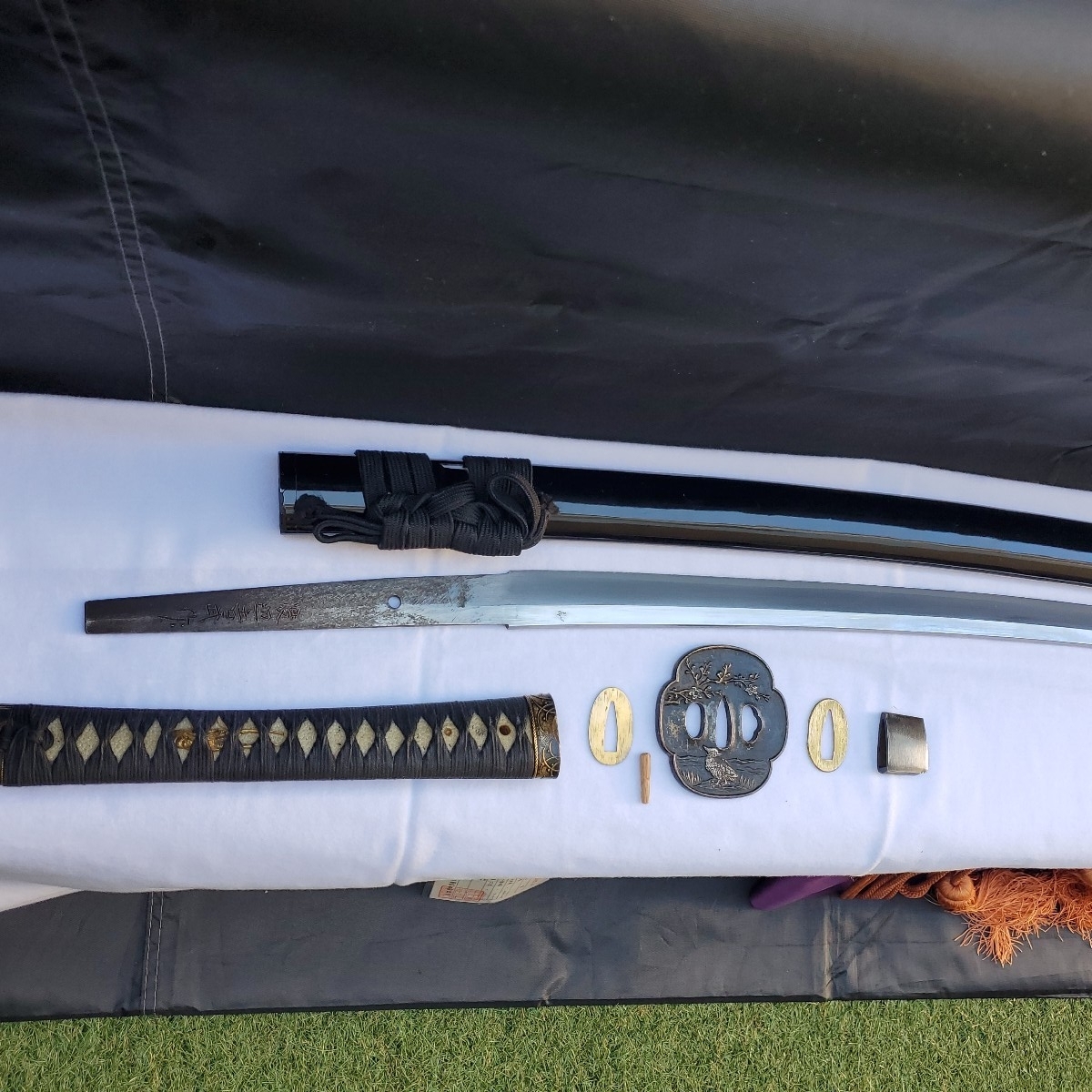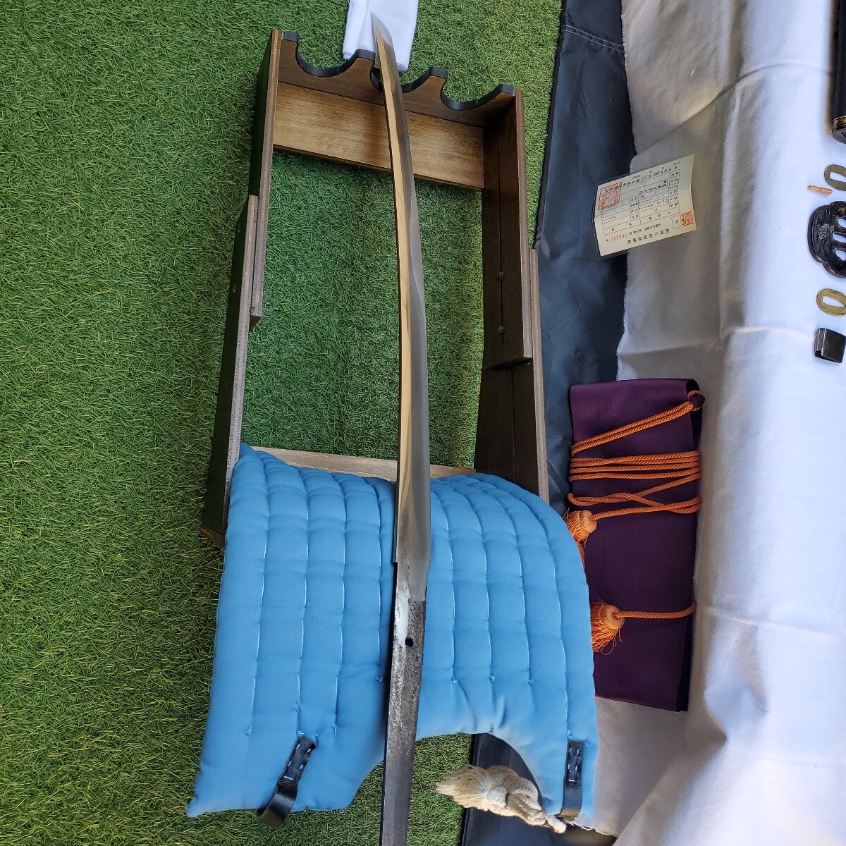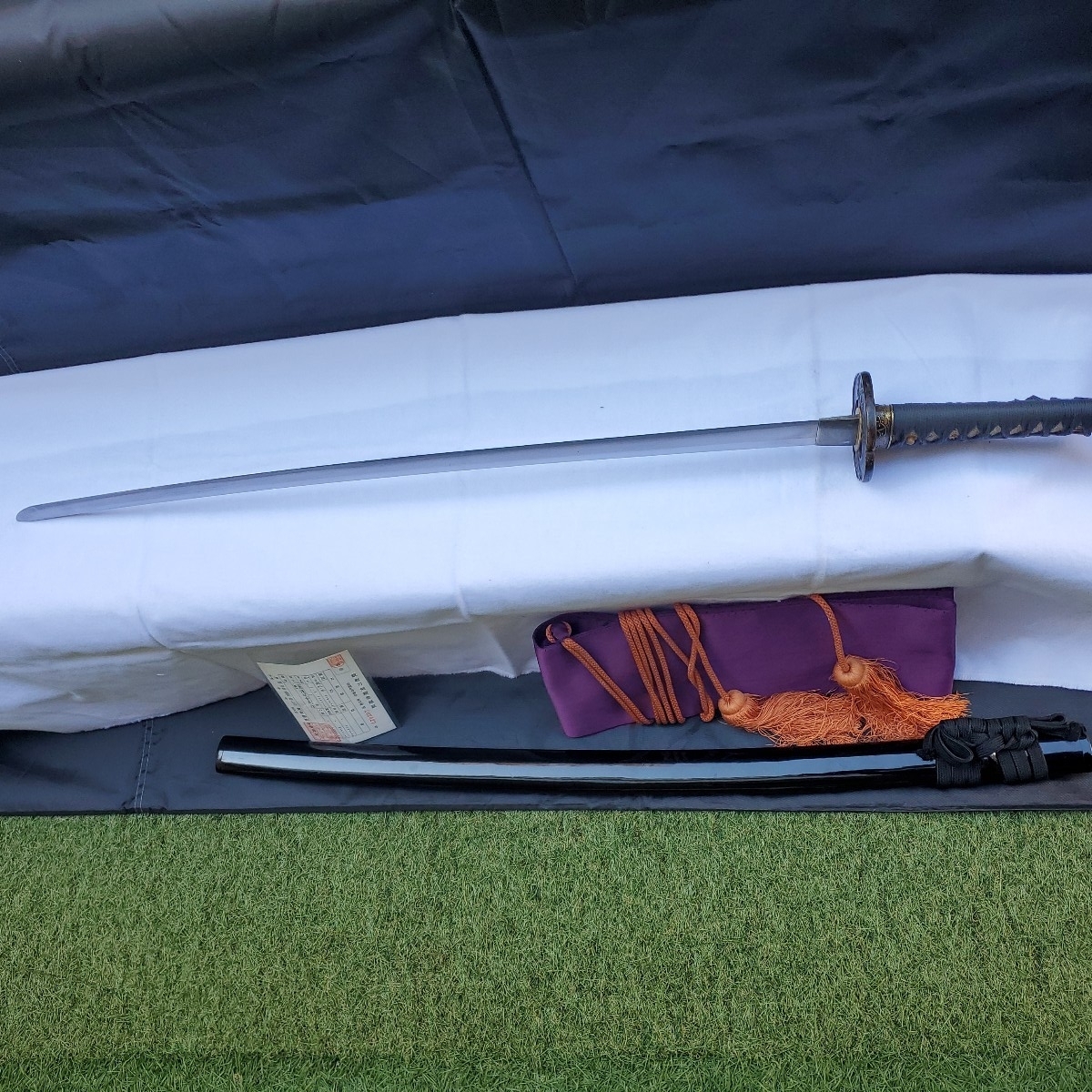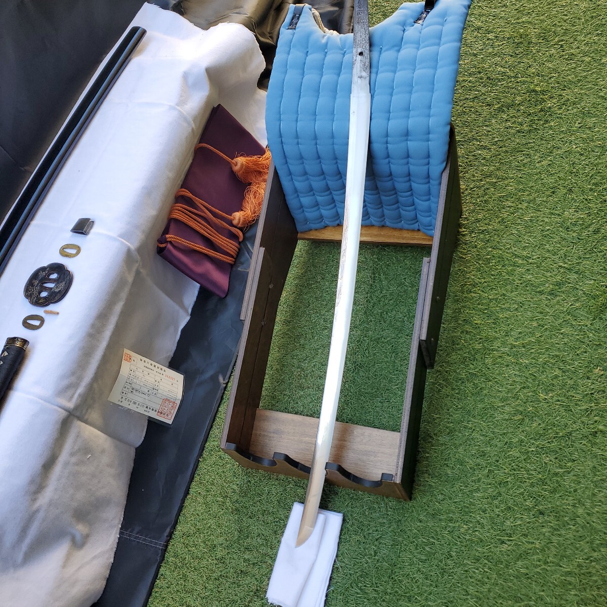 の重量もありますので抜刀には向いているのではないかと思っています。キズのご報告としましては、写真⑥で黒い斑点が付いている以外は気になる箇所はないかと思います。尚、写真撮りの上で素人感が出ていますが出品数も少ないので御容赦下さい。また、ご購入の際は返品扱いはございませんのでご理解下さいますようお願いいたします。
