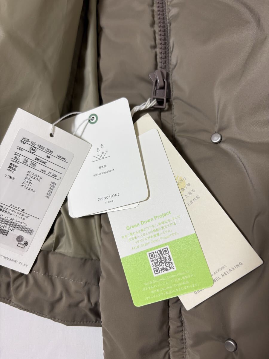 『ユナイテッドアローズ グリーンレーベル」のダウンコートです。サイズ・・・36(身幅約65cm、着丈約80cm)。素材・・・表地、裏地ともポリエステル100%。中綿・ダウン80%、フェザー20%。カラー・・・ベージュ。定価・・・29700円。マットな質感で落ち着いた雰囲気のダウンコートです。ひとつひとつのパーツごとに中わたの分量が変わっているので、ふっくらとしたボリューム感はありながらもすっきりとしたシルエットになっています。ヒップの隠れる着丈ですが、長すぎないので着まわしやすいと思います。袖口の内側のリブ仕様や調節可能な裾のコードなど、細部までこだわっています。数年前に購入し、未使用タグ付きの自宅保管品です。1度個人の手に渡ったものですので、神経質な方はご遠慮ください。よろしくお願いいたします。