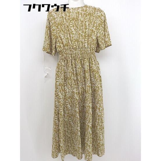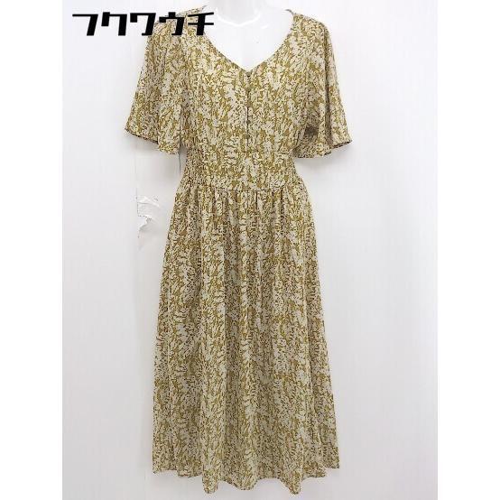 ◇ RAY CASSIN Vネック 総柄 ウエストゴム 五分袖 ロング ワンピース サイズM マスタード アイボリー レディース