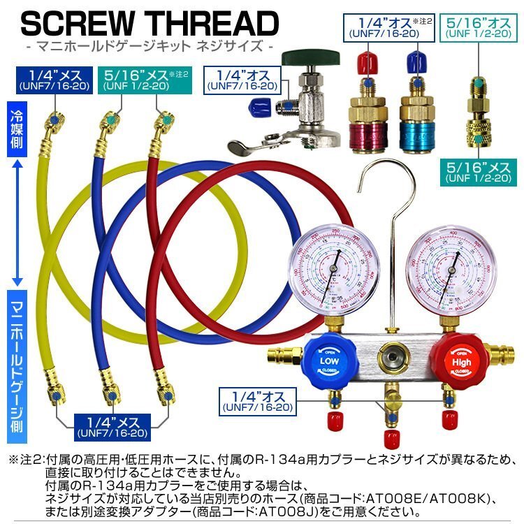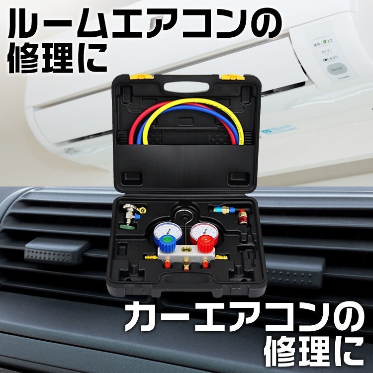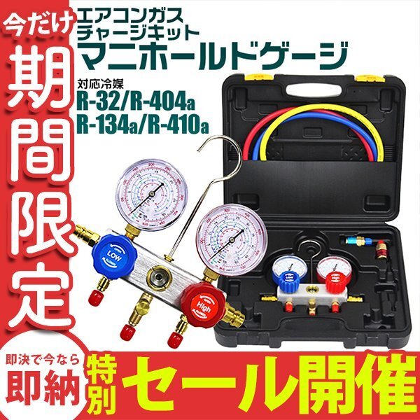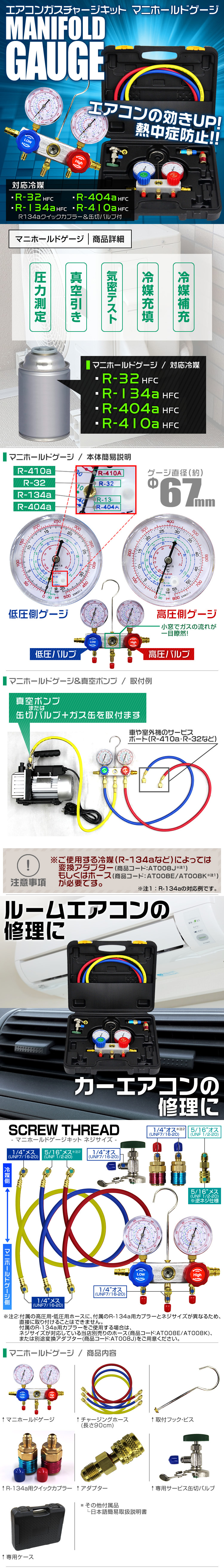 | 【仕様】 対応冷媒R134a R32 R410A R404A 【セット内容】 2バルブゲージ付マニホールド(取付用フック付) ×1 チャージングホース青赤黄(約900mm) ×3 R134a用 高圧用クイックカプラー×1 R134a用 低圧用クイックカプラー ×1 R410aアダプター ×1 専用サービス缶切バルブ付き ×1 専用ケース付き 説明書 ●入荷時期により写真と実物(色の変更など)は多少異なる場合がございます。 あらかじめご了承下さい。 ●もちろん新品未使用品です。 ■オプション商品■ □マニホールドゲージ用ホース3本セット 150cm(R-12,R-22,R-134a,R-404,R-502) □マニホールドゲージ用ホース3本セット 90cm(R-410a専用) □バルブ式クイックカプラー R134a □クイックカプラー R134a □マニホールドゲージ用変換アダプター フレアサイズオス1/4メス5/16 □アルミ製パイプベンダー □ダブルフレアリングツールキット