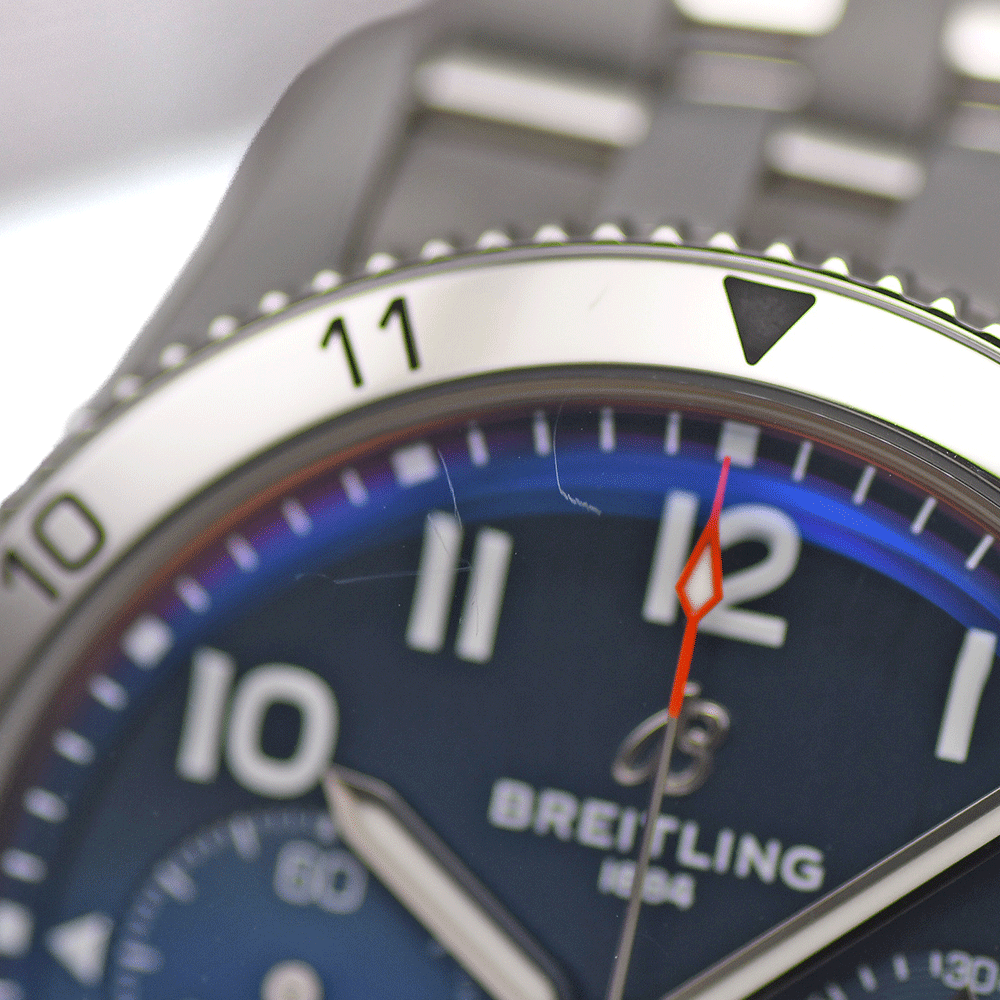 当店の提携時計修理業者にて研磨仕上げ済み。11時位置のガラス無反射コーティングに小キズ有り。外装に関しては光沢も感じられ、特筆すべき目立ったダメージはございません。全体的なコンディションは良好で、使用回数は少ない印象です。 |