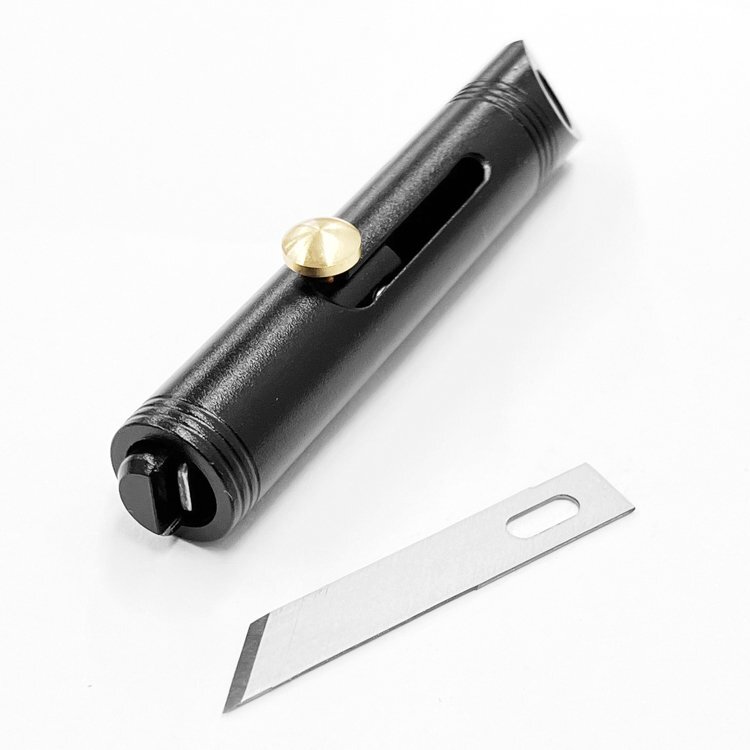 ツマミをスライドさせて引き出したカッター刃を、ボルトアクションのようにロックして使用します。