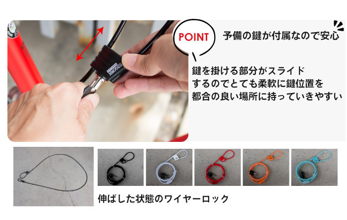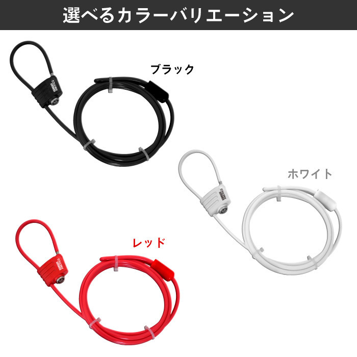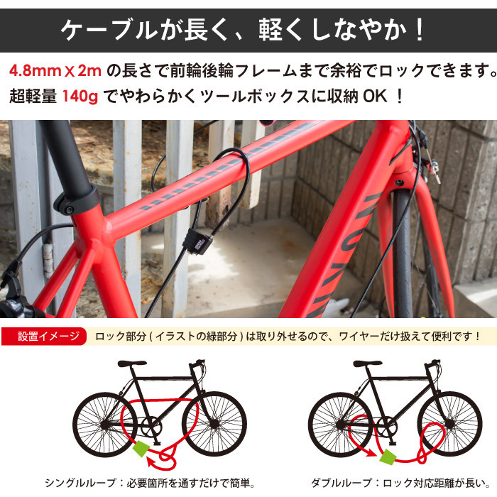 自転車駐輪時の盗難防止に活躍するケーブルロック 超軽量なので気軽なサイクリングにも荷物にならずに持ち運べます。 スペアーが2本あるので安心 ツールケースやサドルバッグにも入ります。 ・コンパクトになるので持ち運びも楽々 ・万が一カギを無くしてもスペアーキーあり ・自転車全般、ロードバイク、マウンテンバイク、クロスバイク、ミニベロに 1台のパーツを丁寧にロックしたり、複数台通してロックしてもOK! ・2mの長さで、前後ホイールとフレームを通しても余裕があります。 車体にも通しやすい柔軟性のあるケーブルなのでツールケースにも入りコンパクト ・錠部分は取り外しケーブルだけで扱えるので軽くて便利です。 また、ケーブル全体にラバーコートされているので車体を傷つけません。 鍵サイズ:幅W36.9 x 直径D15.6 x 高さH29mm ケーブルサイズ:直径φ4.8mm / 長さL2000mm 重量:140g 付属:カギ2本、説明書 商品のカラーはディスプレイ種類環境等により実物と異なって見える場合がございます。 入荷時より細かい傷やある事があります。気になる方や神経質な方はご購入をご遠慮ください。 | |