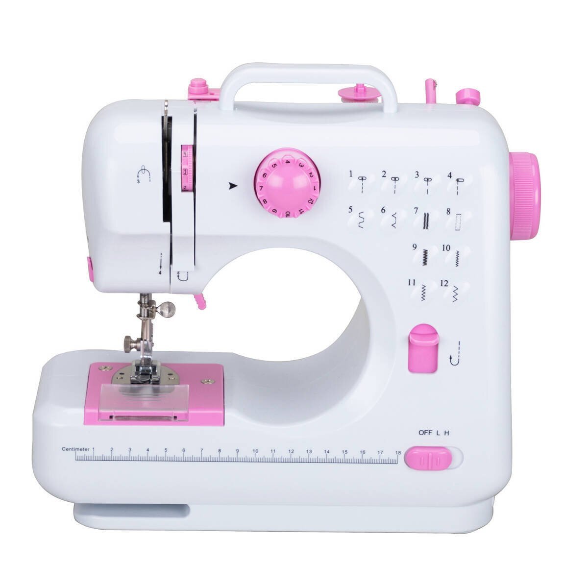 直線縫いやジグザグ縫いなど、一般的な12針を厳選したシンプルなデザイン。左のダイヤルを回すだけで縫製パターンを切り替えることができ、デニムの厚手の素材ややわらかい素材などを縫うことができます。シルクのように。 (ダイヤルを回す前に、ミシンの針が一番高い位置まで上がっていることを確認してください)。
