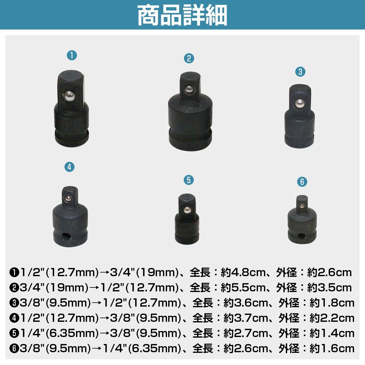 商 品 説 明差込角サイズを変換できるインパクトレンチ対応のソケットアダプターセットです。