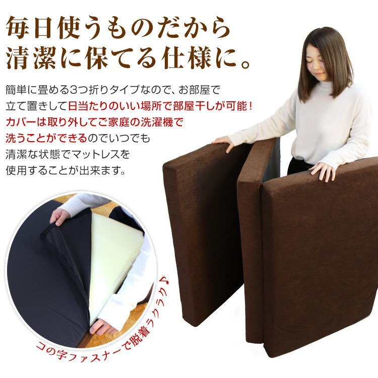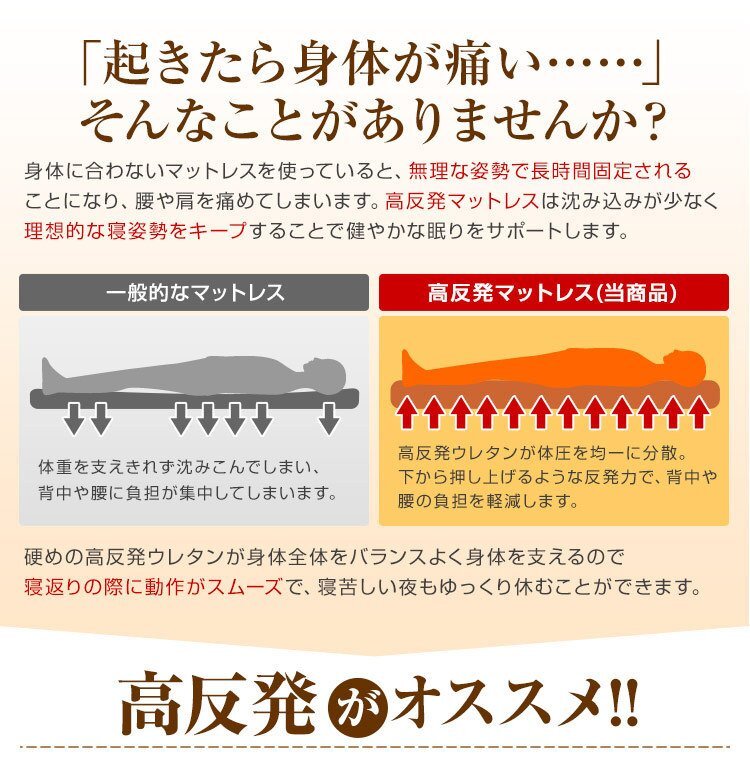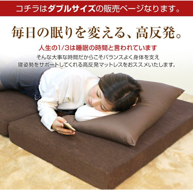厚みたっぷり10cm! 適度な硬さで身体をしっかり支える、三つ折りタイプの高反発マットレスです。 柔らかいマットレスとは違い、身体の沈み込みを軽減した腰に優しい寝心地です。 高反発マットレスのウレタンフォームは弾性が高く、適度な硬さで身体を支えるので、底つき感もなくへたりにくいマットレスです。 寝返りが多い方や仰向けに寝ることが多い方におススメです。 簡単にたためる三つ折りタイプなので、お部屋で立て置きして日当たりのいい場所で部屋干しが可能! 取り外しやすいL字ファスナー付き洗えるカバーが付属しています! 【商品仕様】 【商品内容】 カラー:ブラウン サイズ(約):幅140cm×長さ195cm×厚み10cm(ダブルサイズ) 折り畳み時(約):幅97cm×長さ65cm×厚み30cm 素材:高反発ウレタン 、パイル生地 他 硬さ:200ニュートン 【注意事項】 耐熱仕様ではございませんので、電気毛布との併用はおやめください。 |