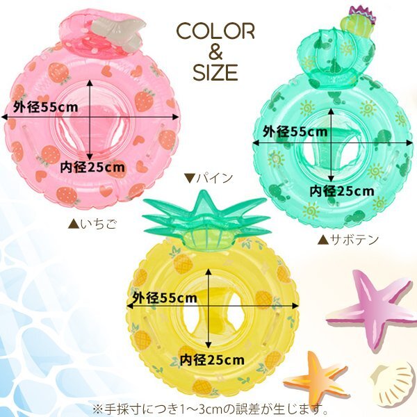☆ベビーフロート いちご パイン サボテン ※ご購入されましたらオーダーフォームに以下のタイプをご連絡ください。 【タイプ】 ・いちご ・パイン ・サボテン 【商品名】 ベビーフロート いちご パイン サボテン 【商品説明】 背もたれが付いたかわいいキッズフロートです。 バランスを取りやすい持ち手付き。体がずり落ちるのを防ぐ足入れタイプなので水慣れしていないお子様でも安心の設計。 ゴールデンウィークや夏休みのプール・海水浴はこれで決まり♪ 【タイプ】 ・いちご ・パイン ・サボテン 【サイズ】 外径:55cm 内径:25cm ※メーカーサイズ表記ですが、多少の誤差が生じる場合がございます。 【対象年齢】 1~6才 キーワード [ ストロベリー 苺 キッズ ベビーフロート 取っ手付き 足穴 落下防止 落ちない 子供用 夏休み 旅行 GW ゴールデンウィーク おしゃれ かわいい パステル 海 ] |