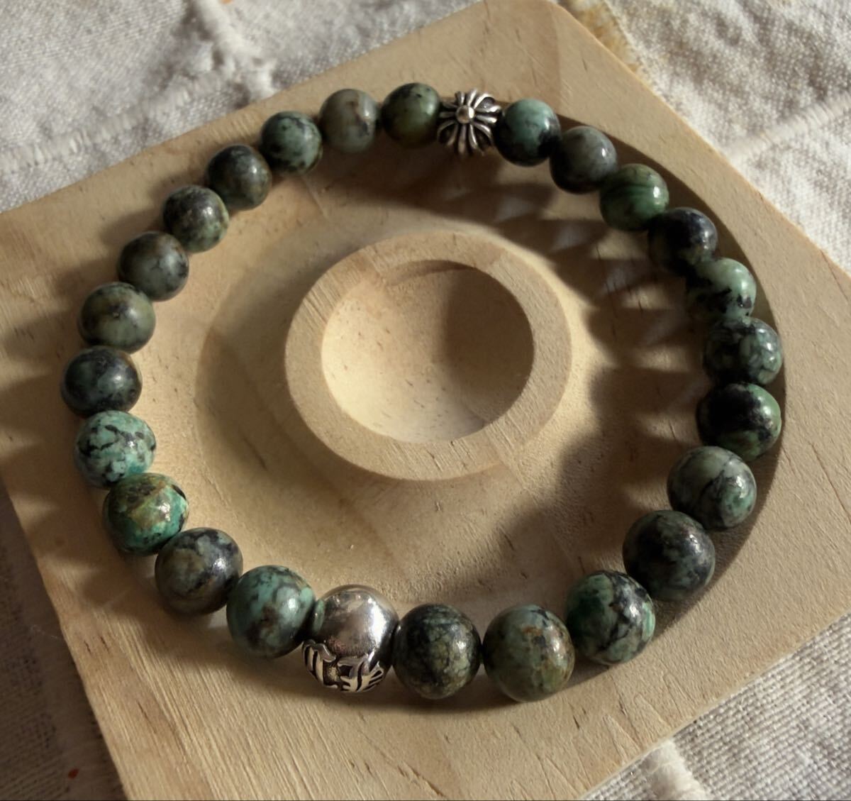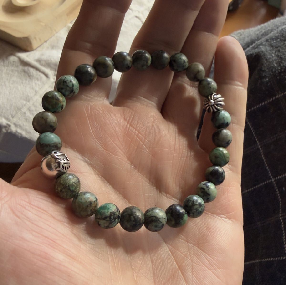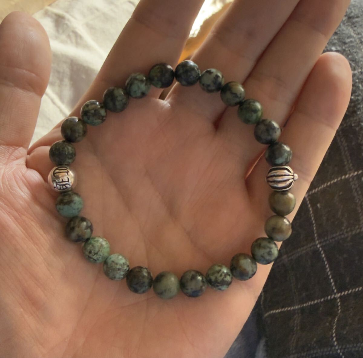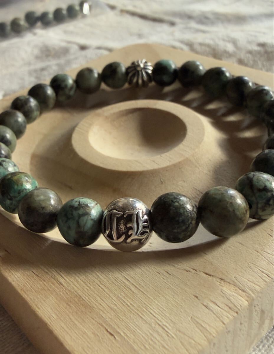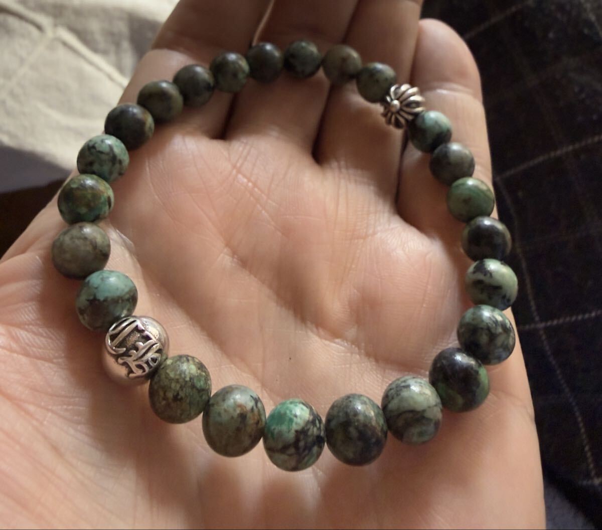冬場はキチキチのビーズブレスレットだと袖から出ないことありますよね、19cmの大きさと19gの重さで常に袖口から出るかと思います。ワンポイントのオシャレに最適です!アフガンターコイズはパワーストーンでも有名な天然石です。現在天然ターコイズは高騰しすぎて手に入らない状態が続いております。しかしながら、アフガンターコイズも何故かchボールと合わせると不思議な魅力があり、天然石のなせる技なのかもしれませんね。