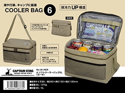 6L・カーキ 6L UE-626・・Color:カーキStyle:6L・使用サイズ:(約)幅290×奥行180×高さ190mm・製品重量:(約)370g・容量:(約)6L・材質:本体生地/ポリエステル600デニール、内生地/PEVA(防菌加工)、断熱材/発泡ポリエチレンフォーム、中敷/PEVA・発泡ポリウレタン・ポリエチレン、原産国:中国・特徴:従来品より保冷力UP構造・防菌加工生地使用・中敷付き・前面/内側メッシュポケット付き・コンパクト収納海や行楽、キャンプに最適。 保冷力アップ構造。 従来品に比べ、ファスナー部分を天面より下げることにより生地が2重になりファスナー部分から冷気が逃げるのを防ぎます。 内側に防菌加工生地を使用。 中敷付き。中敷は底面に敷いて、荷崩れ防止に。また上面、飲食物にふたをするように使用するとファスナー部分から冷気が逃げるのを防ぎます。 前面には出し入れしやすいメッシュポケット付き。小物入れに便利。 内側には保冷剤が入れられるメッシュポケットを装備。 収納時はフタ面内側についているマジックベルトでコンパクトに収納可能。持ち運び、保管に便利。 使用サイズ:(約)幅290×奥行180×高さ190mm 製品重量:(約)370g 容量:(約)6L 材質:本体生地/ポリエステル600デニール、内生地/PEVA(防菌加工)、断熱材/発泡ポリエチレンフォーム、中敷/PEVA・発泡ポリウレタン・ポリエチレン 原産国:中国